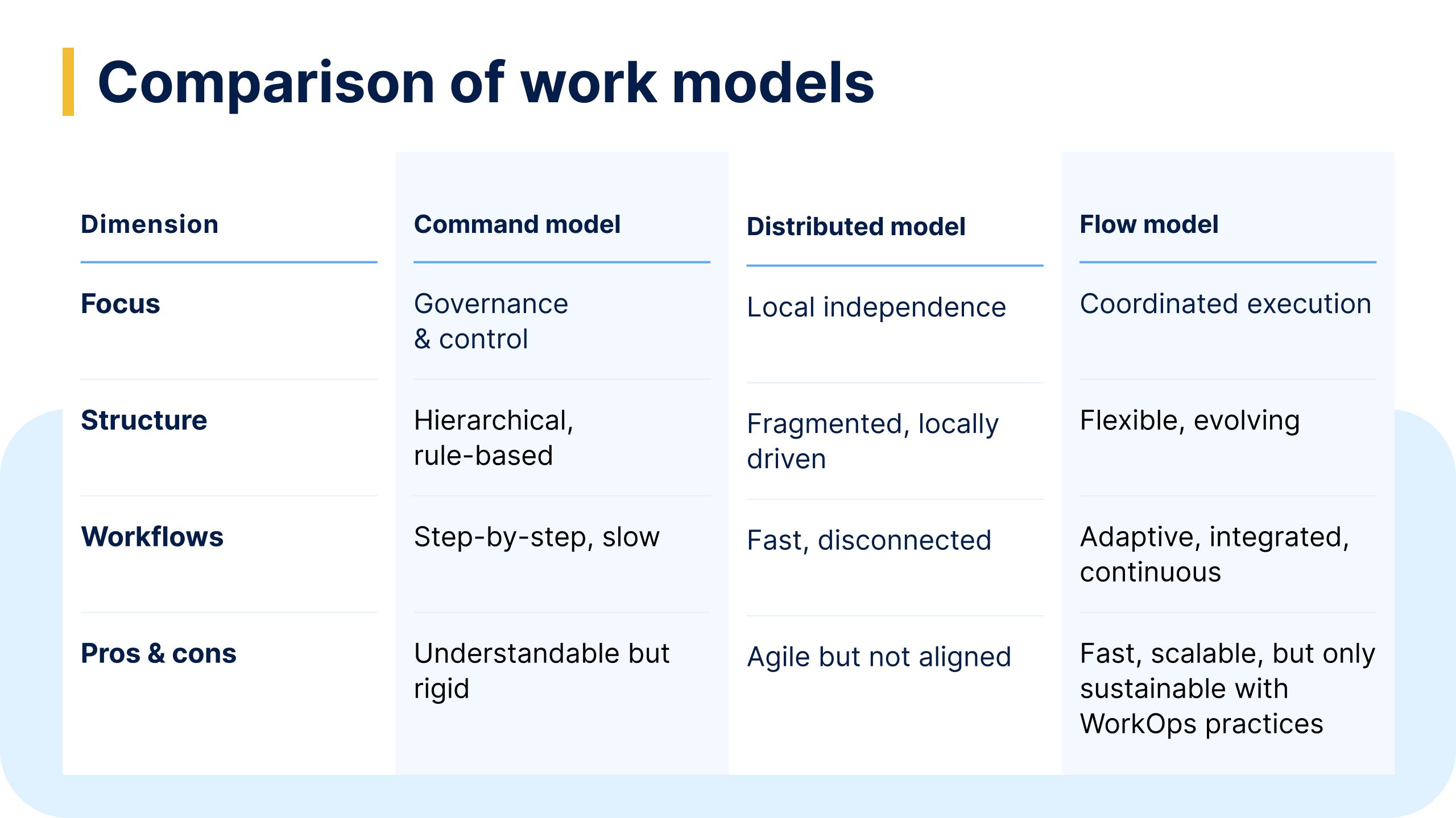 On the other hand, the Distributed model of work prioritises local autonomy over central control. Its organisational design is inconsistent, and processes are often disjointed across teams. The main trade-off is that while this model is fast, it is often uncoordinated.