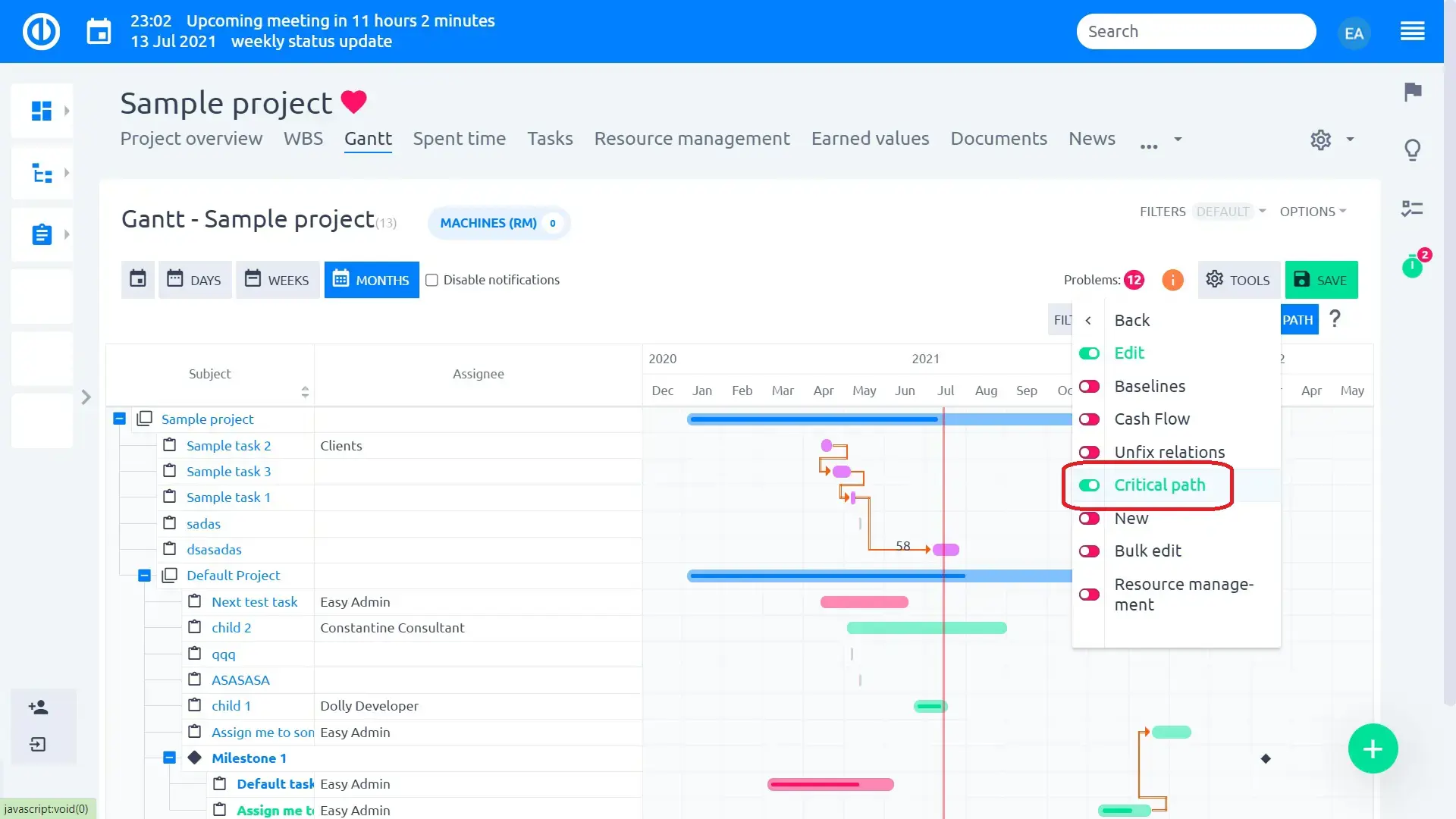Kritická cesta může být jednoduše zobrazena pomocí pluginu Easy Gantt na úrovni projektu. Stačí otevřít projekt s povoleným modulem Easy Gantt, přejděte do příslušného modulu a najdete tlačítko Kritické cesty v pravém horním menu.