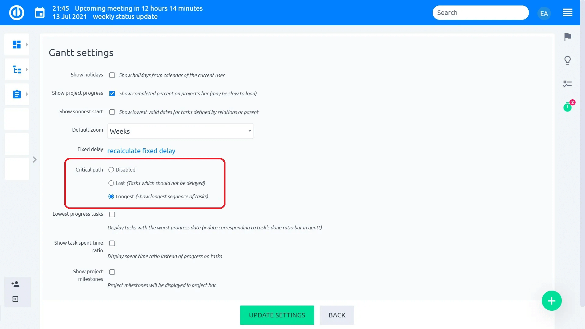 V Easy8 existuje i obrácená možnost Kritické cesty, která zobrazuje nejdelší cestu místo nejkratší. Nebo ji můžete zcela vypnout v možnostech Ganttu.