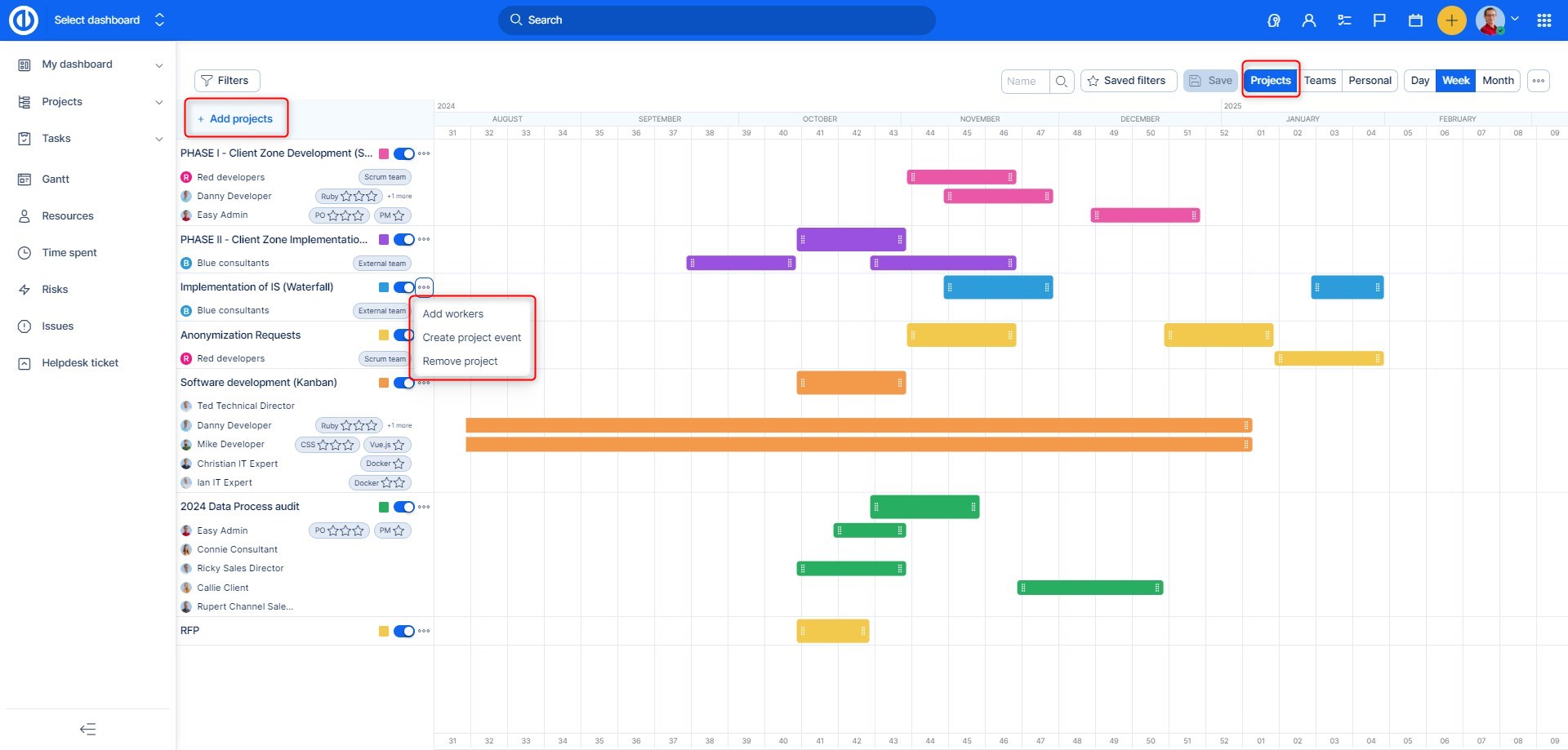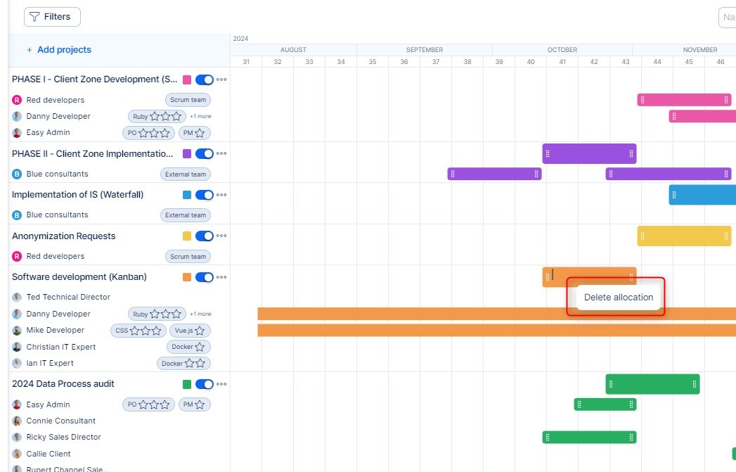 V levé dolní části vidíte seznam projektů, týmů či pracovníků, podle kterých jsou strukturované alokace na časové ose. Za každou položkou seznamu vidíte barvu této položky na časové ose, dále je zde přepínač pro rychlé zobrazení/skrytí této položky na časové ose a hned vedle najdete tři tečky, pod nimiž se skrývají různé možnosti, které můžete s danou položkou udělat. Například k projektu můžete přidávat pracovníky, vytvořit projektovou událost, nebo projekt odstranit. Tým můžete upravit, přidat projekty či pracovníky do týmu, nebo jej smazat. U jednotlivých pracovníků můžete upravit jejich dovednosti nebo zobrazit/skrýt paralelní alokace( tyto alokace se po aktivaci zobrazí pouze v teamovém zobrazení) . Pořadí jednotlivých projektů, týmů i pracovníků v seznamu můžete libovolně měnit použitím funkce drag-and-drop.