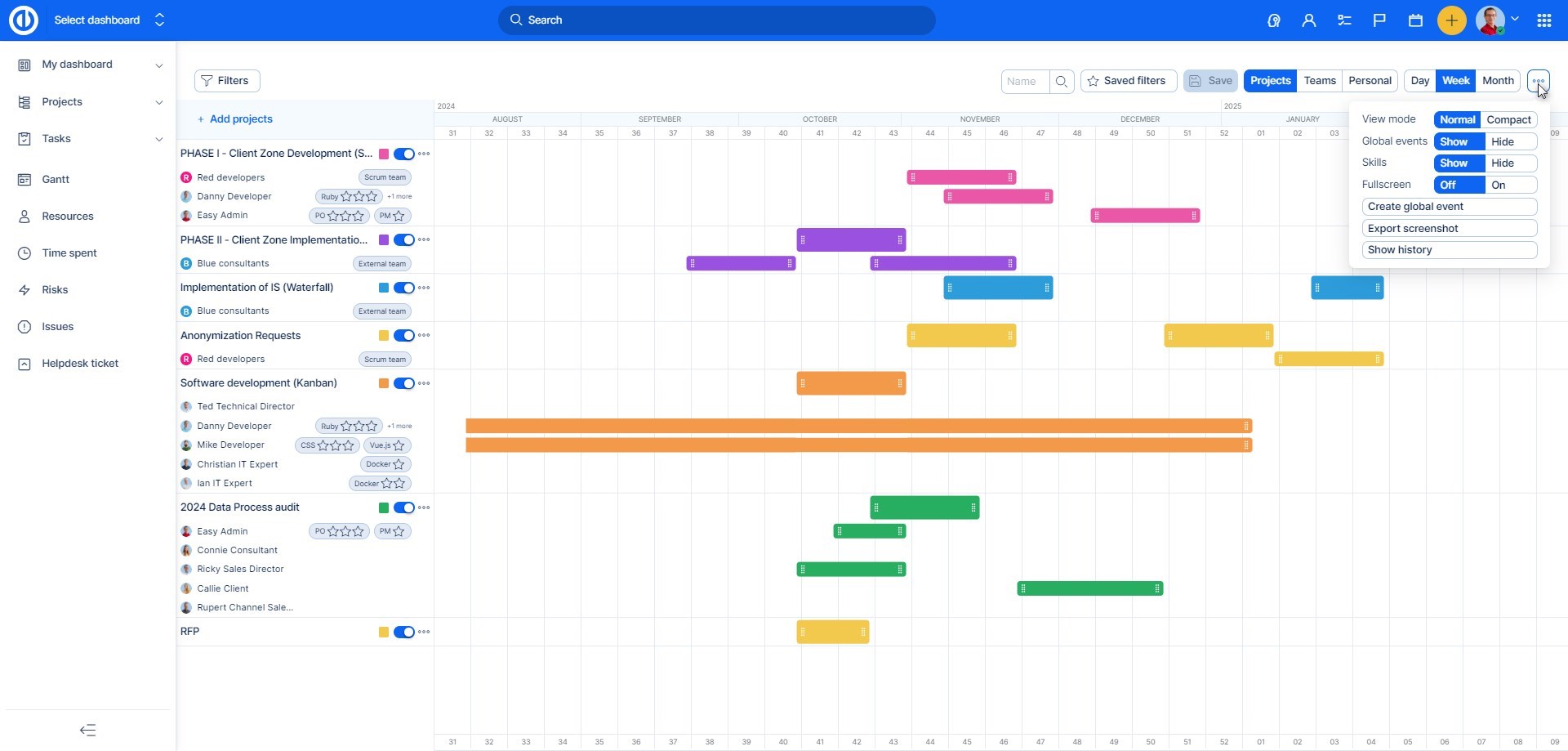 - Tři tečky: Zde máte možnost měnit režim zobrazení (normální, kompaktní), zobrazit či schovat globální události, skills management, či aktivovat zobrazení na celou obrazovku pro lepší viditelnost. S pomocí níže položených tlačítek můžete vytvořit globální událost, která se zobrazí na časové ose k určitému datu včetně vloženého jména a komentáře, dále máte možnost exportovat (stáhnout) screenshot časové osy ve formátu JPEG či PNG, a nakonec si můžete zobrazit historii změn provedených v tomto nástroji, včetně možností filtrování pro historii.