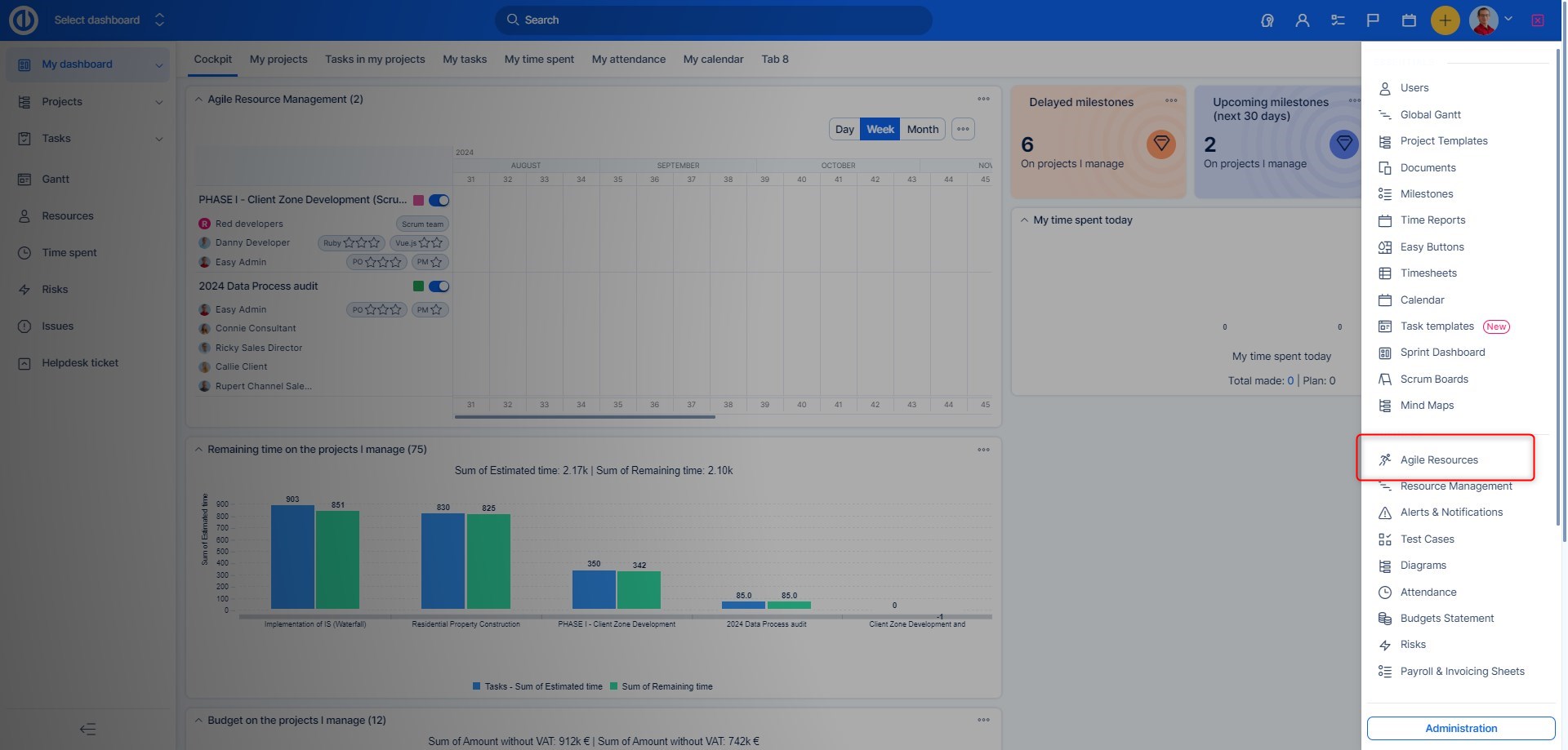 K Agilnímu řízení zdrojů můžete přistoupit dvěma způsoby. Prvním z nich je položka v menu Globální menu >> Rozšiřující moduly >> Agilní řízení zdrojů.