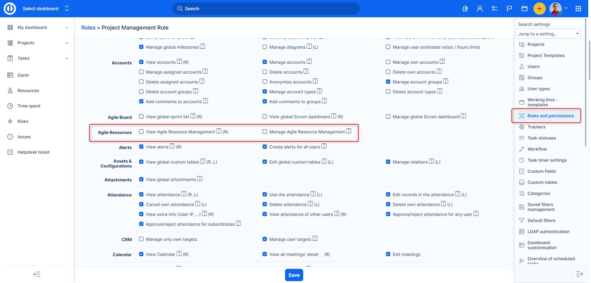 Zapomenout bychom neměli na nastavení uživatelských práv, a to v Administrace >> Role a práva >> vyberte roli >> Globální práva >> Agilní řízení zdrojů. Zde jednoduše zaškrtnete, zda příslušná uživatelská role má právo zobrazit Agilní řízení zdrojů a zda jej smí spravovat (tzn. provádět v něm změny).