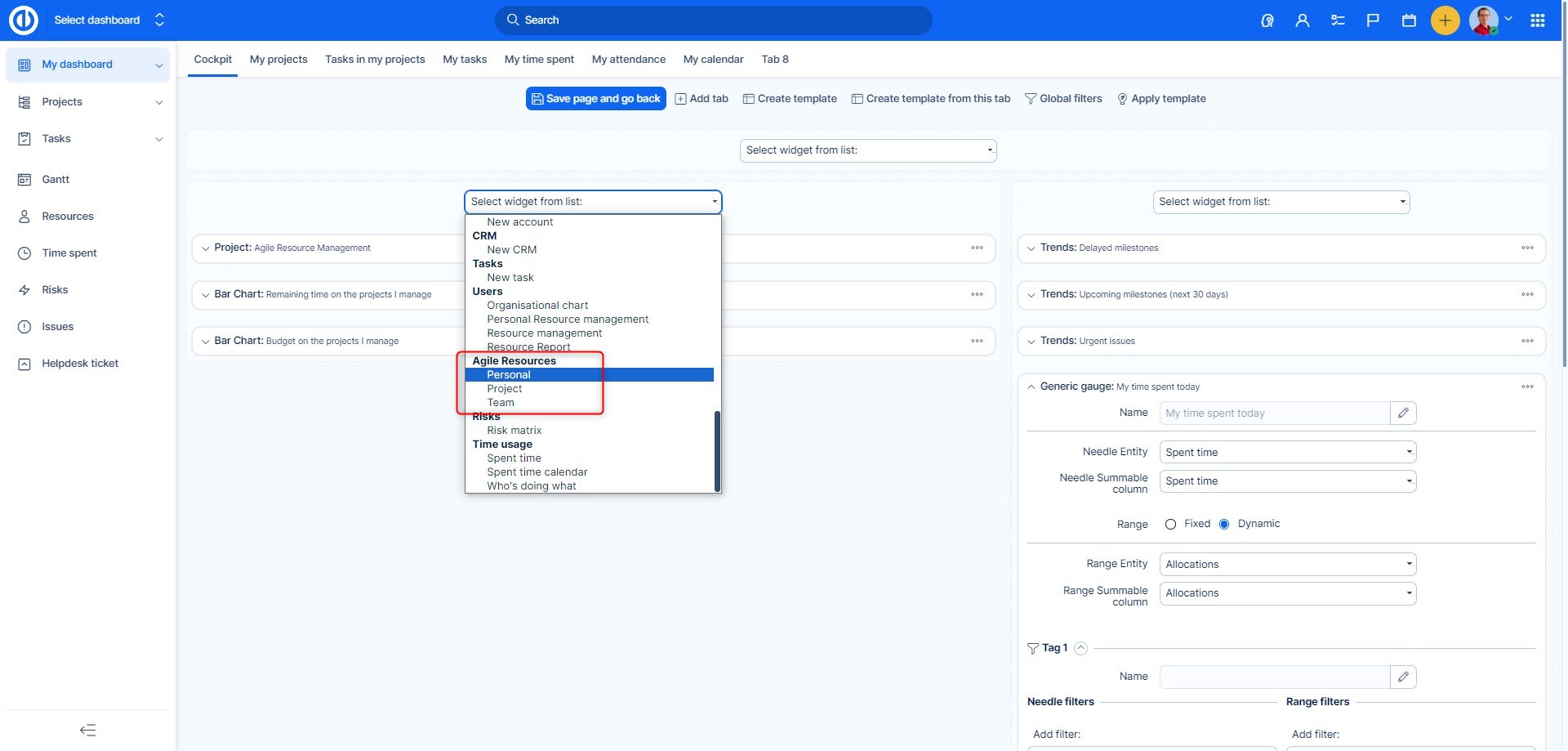 Druhý způsob, jak přistoupit k Agilnímu řízení zdrojů je widget na stránce Můj dashboard. Jednoduše jděte na libovolný Dashboard a klikněte na tlačítko Přizpůsobit stránku v její dolní části. Vyhledejte v seznamu widgetů sekci Agilní řízení zdrojů a vyberte jednu ze dvou možností: projektové a personální. Jak vidíte, widget na Dashboardu se omezuje vždy na projektové či personální zobrazení a nelze mezi nimi v reálném čase přepínat. Můžete si však na jednu stránku přidat neomezené množství těchto widgetů s různým nastavením. V rámci nastavení widgetu můžete zvolit název widgetu a přednastavit kritéria filtrování.