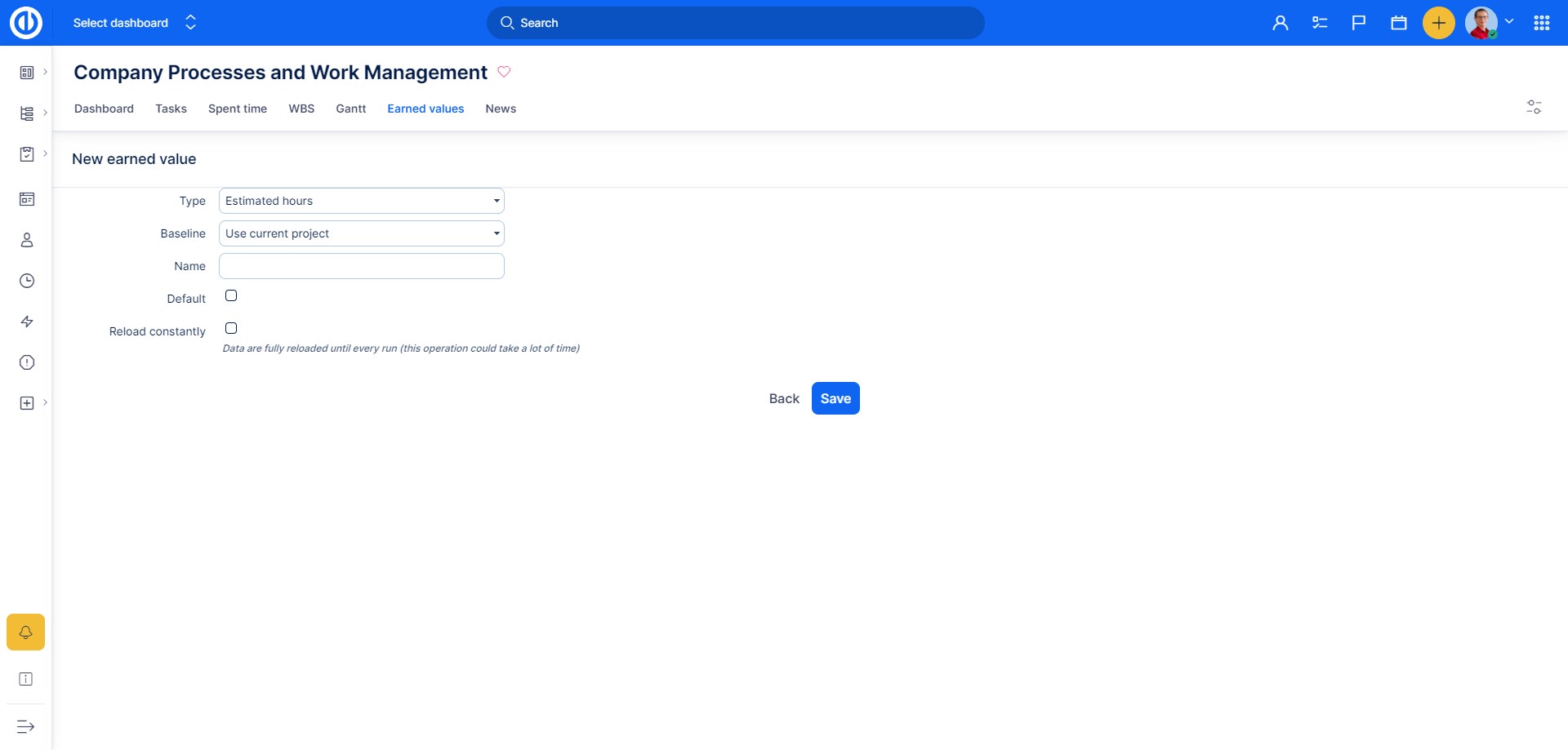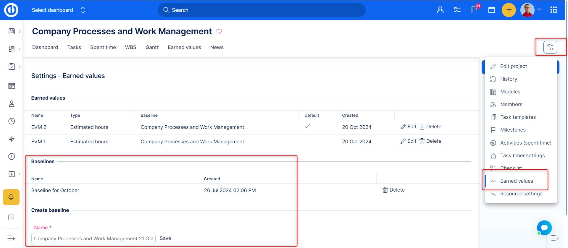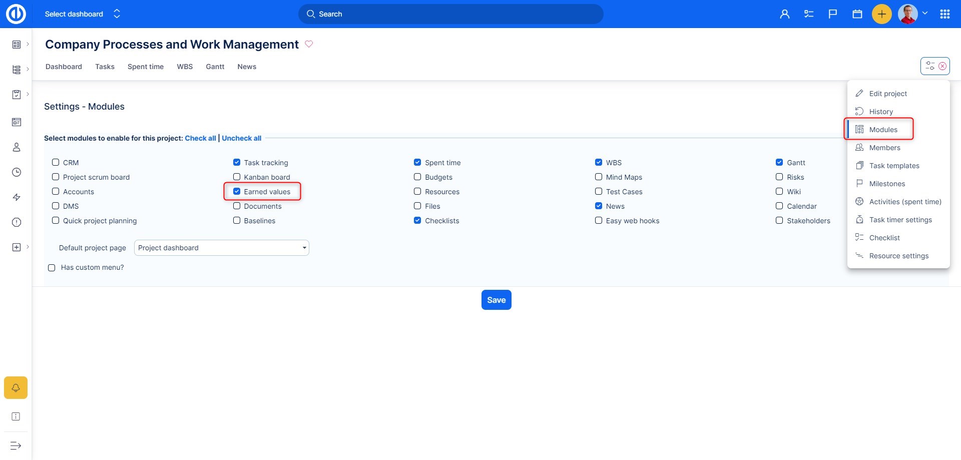 Analýza dosažené hodnoty je modul na úrovni projektů, proto může být povolen v Nastavení projektu >> Moduly. U projektu musí být také povolen Ganntův diagram a Easy Baseline modul, které jsou důležité pro plánování hodnot a zobrazování dat. Záložku modulu pak najdete v horním menu na přehledu projektu, jak je vidět na obrázku.