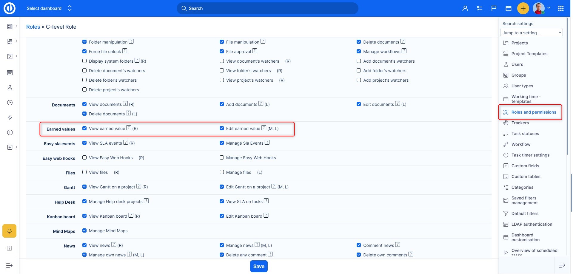 Oprávnění k zobrazení nebo editaci dat v modulu "Dosažené hodnoty" můžete upravit v Globální menu >> Administrace >> Role a práva - vyberte roli - Dosažené hodnoty - postup je vidět na obrázku. Pro zobrazení baseline a nadefinování Plánované hodnoty je potřeba oprávnění k zobrazení a editaci baseline.