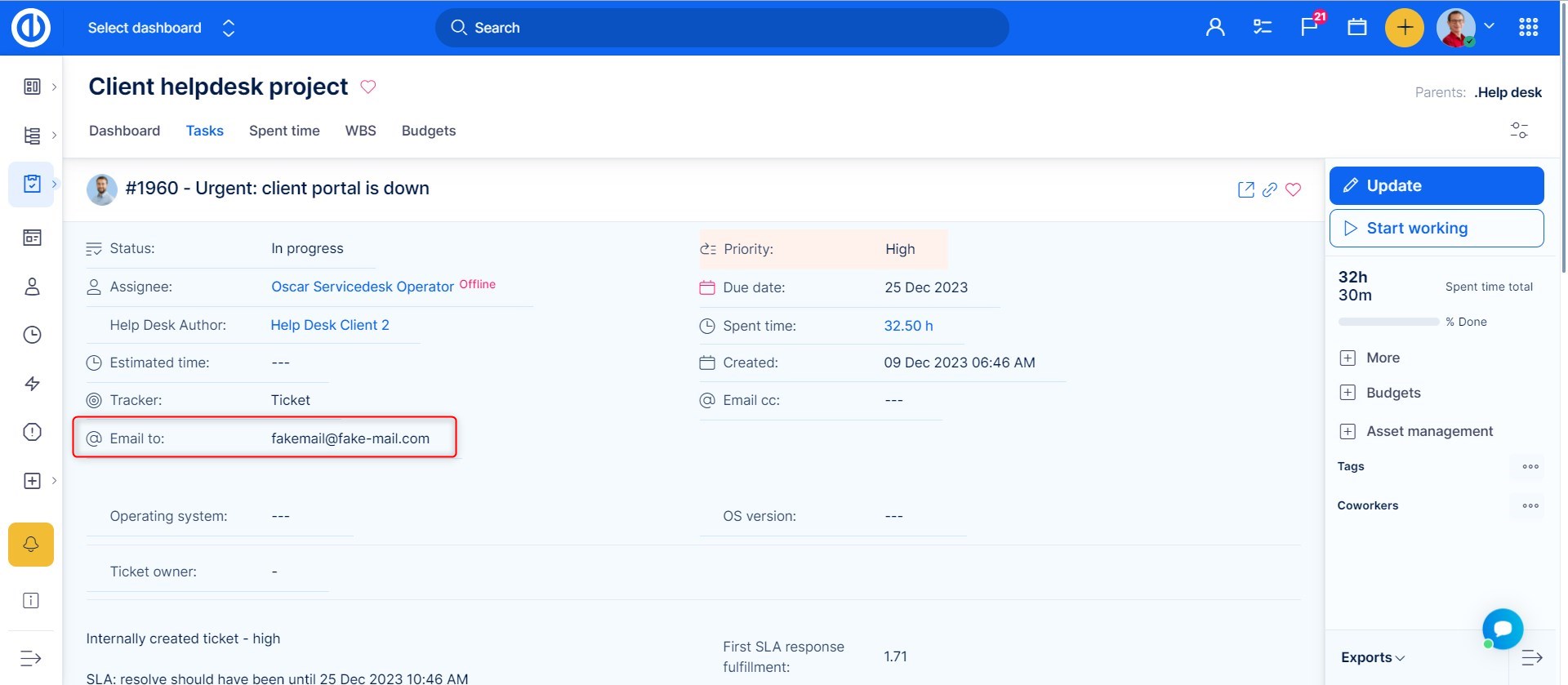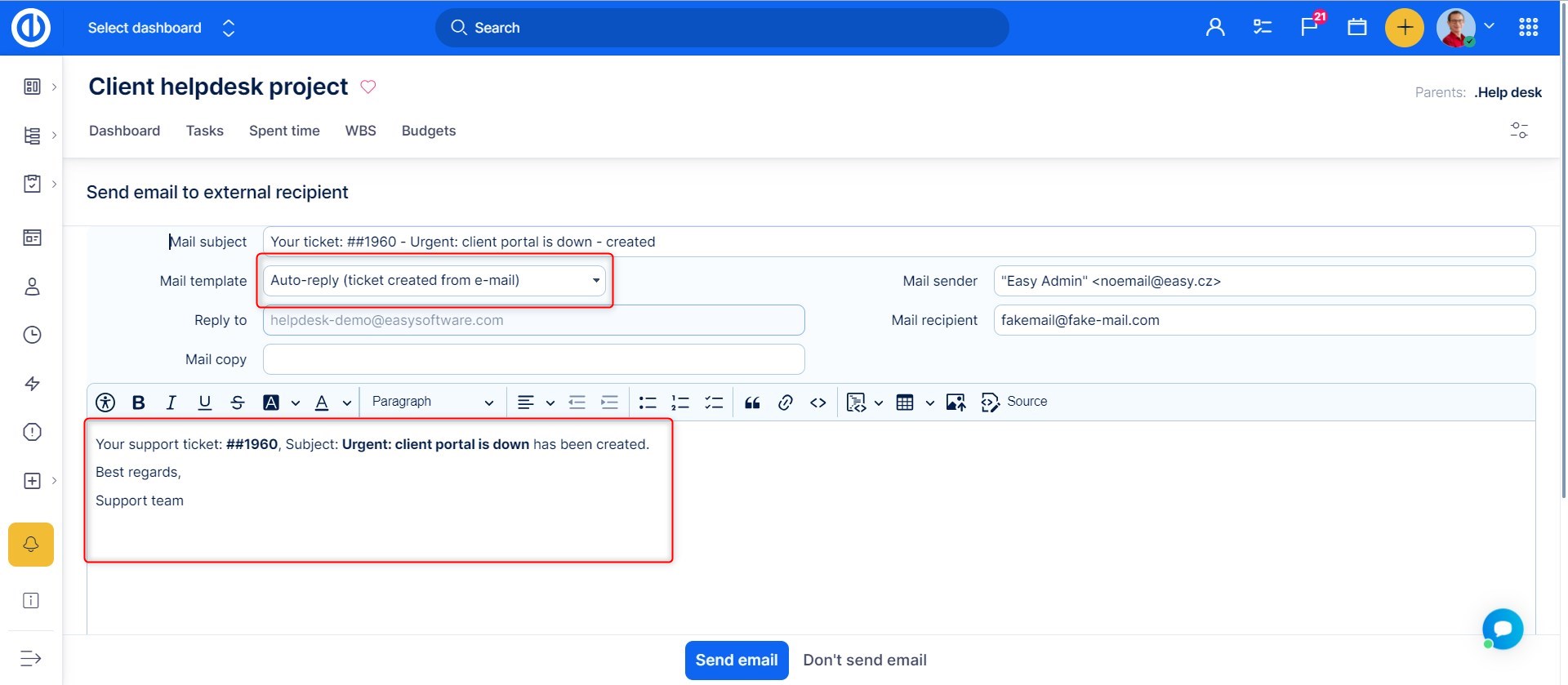 Jak používat šablony. Když vám zákazník pošle e-mail, vytvoří se tiket. Uvidíte externí e-mail v hlavičce tiketu.