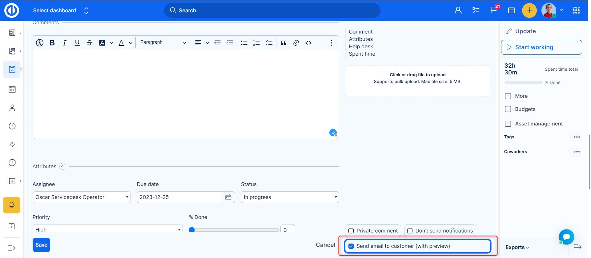 Po aktualizaci tiketu musíte zaškrtnout zaškrtávací políčko "Odeslat e-mail zákazníkovi (s náhledem)".