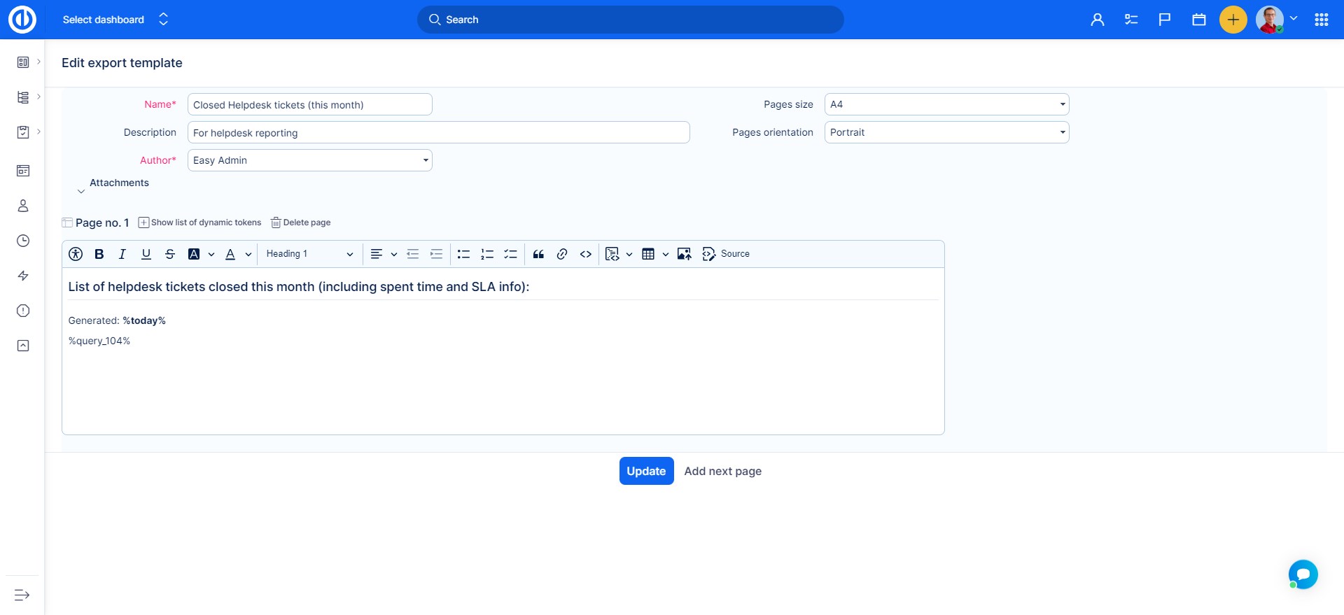 Funkce možností tisku nabízí vytvoření pěkných šablon pro vaše objednávky a faktury, včetně jejich povinného obsahu podle obchodního nebo civilního zákoníku. Pro automatické načtení těchto dat použijte dynamické značky - při tisku úkolů obchodních případů, projektů nebo seznamů z finančních entit tak nebudete muset vyplňovat nic ručně. Jediným vaším úkolem tak bude exportovanou objednávku nebo fakturu poslat příslušné firmě - k tomu se skvěle hodí využít modul Helpdesk.