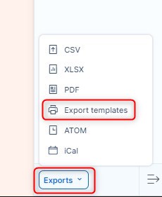 Kdykoliv se vám zobrazí v pravém dolním rohu stránky nabídka Exporty, můžete si obsah dané stránky pomocí nabízené šablony vytisknout. Tato možnost je k dispozici napříč systémem. Zde je několik příkladů, jak tato možnost vypadá: