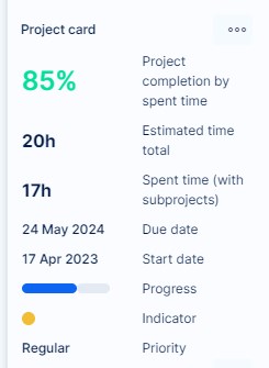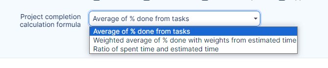 Dokončenost projektu (% dokončení) je počítána třemi různými metodami, jak vidíte níže. Jednu z nich si vyberte v Globální menu >> Administrace >> Nastavení >> Projekty - Vzorec pro výpočet dokončenosti projektu.