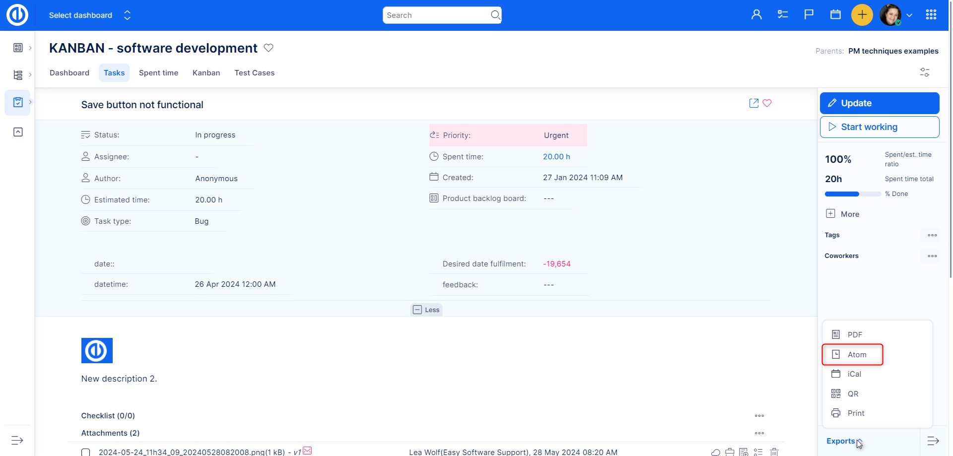2. Export náhledu úkolu (detail) - zkopírujte ATOM link (v pravém dolním rohu vedle nabídky exportu) a vložte link do RSS čtečky. Bude zobrazovat aktualizace vybraného úkolu.
