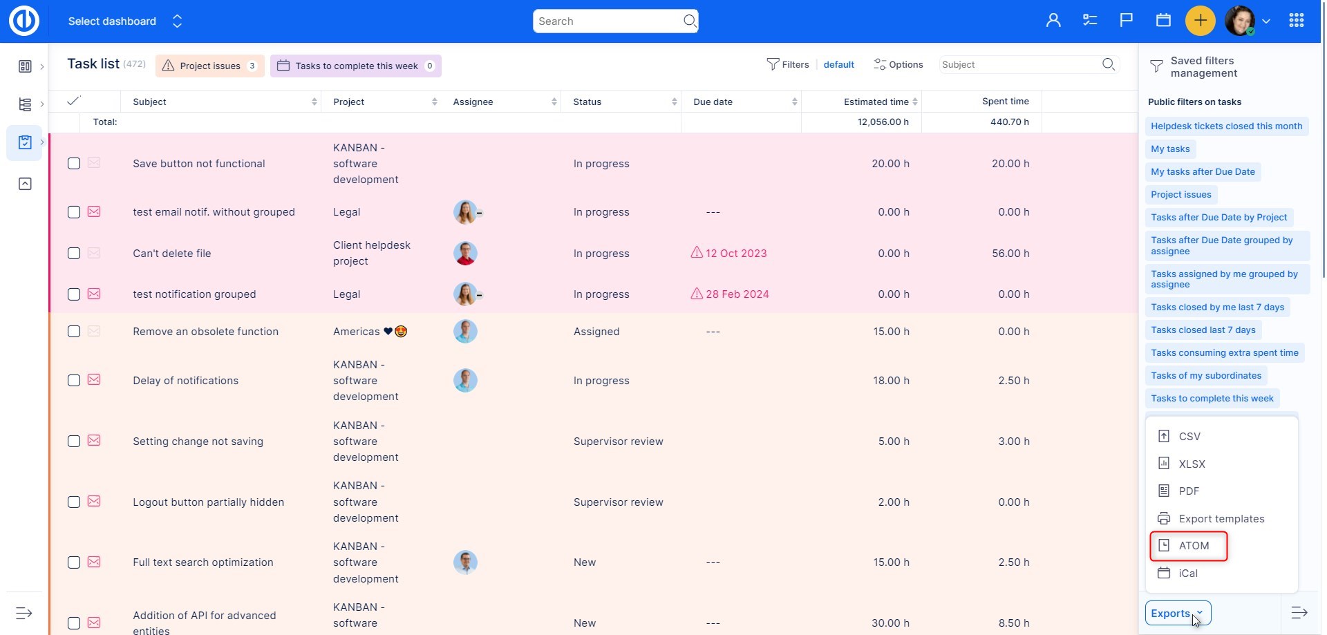 1. Export seznamu úkolů - zkopírujte ATOM link (v pravém dolním rohu vedle nabídky exportu) u kteréhokoliv filtrovaného seznamu a link vložte do RSS čtečky. Bude zobrazovat aktualizovaný seznam úkolů podle nastaveného filtru.