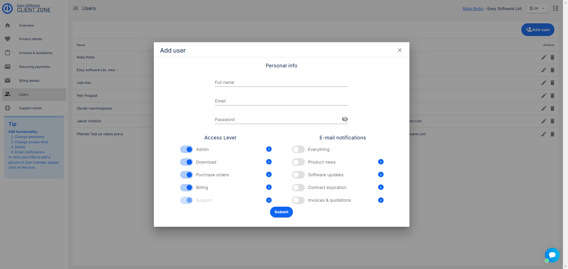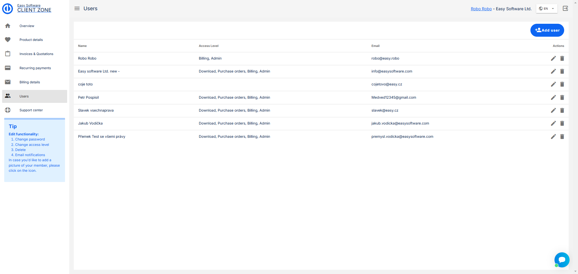 Tato sekce je věnována správě uživatelů, kteří mají přístup do klientské zóny pod vaší společností. Na této stránce můžete vytvářet, upravovat a mazat uživatele. Toto nemá žádný vliv na uživatele ve vašem řešení Easy Project. Uživatelé v klientské zóně jsou odděleni od vašeho řešení.