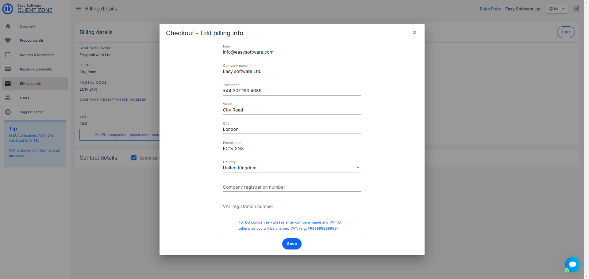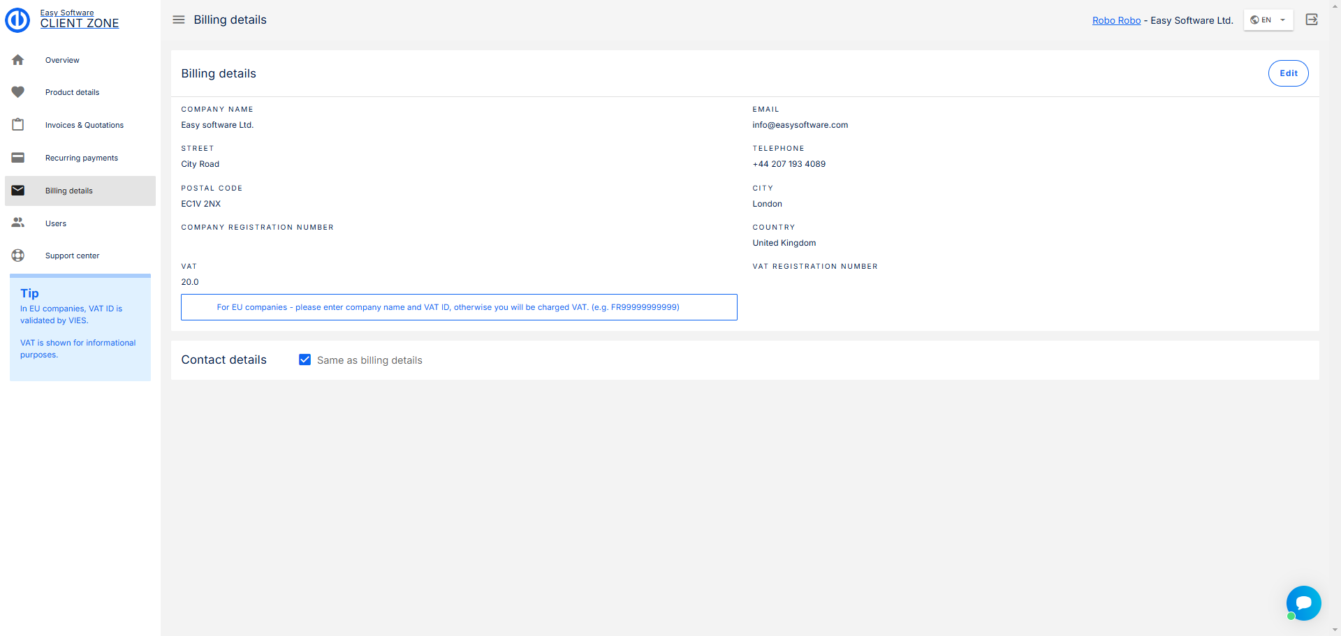 Zde najdete své fakturační údaje s možností je upravit.