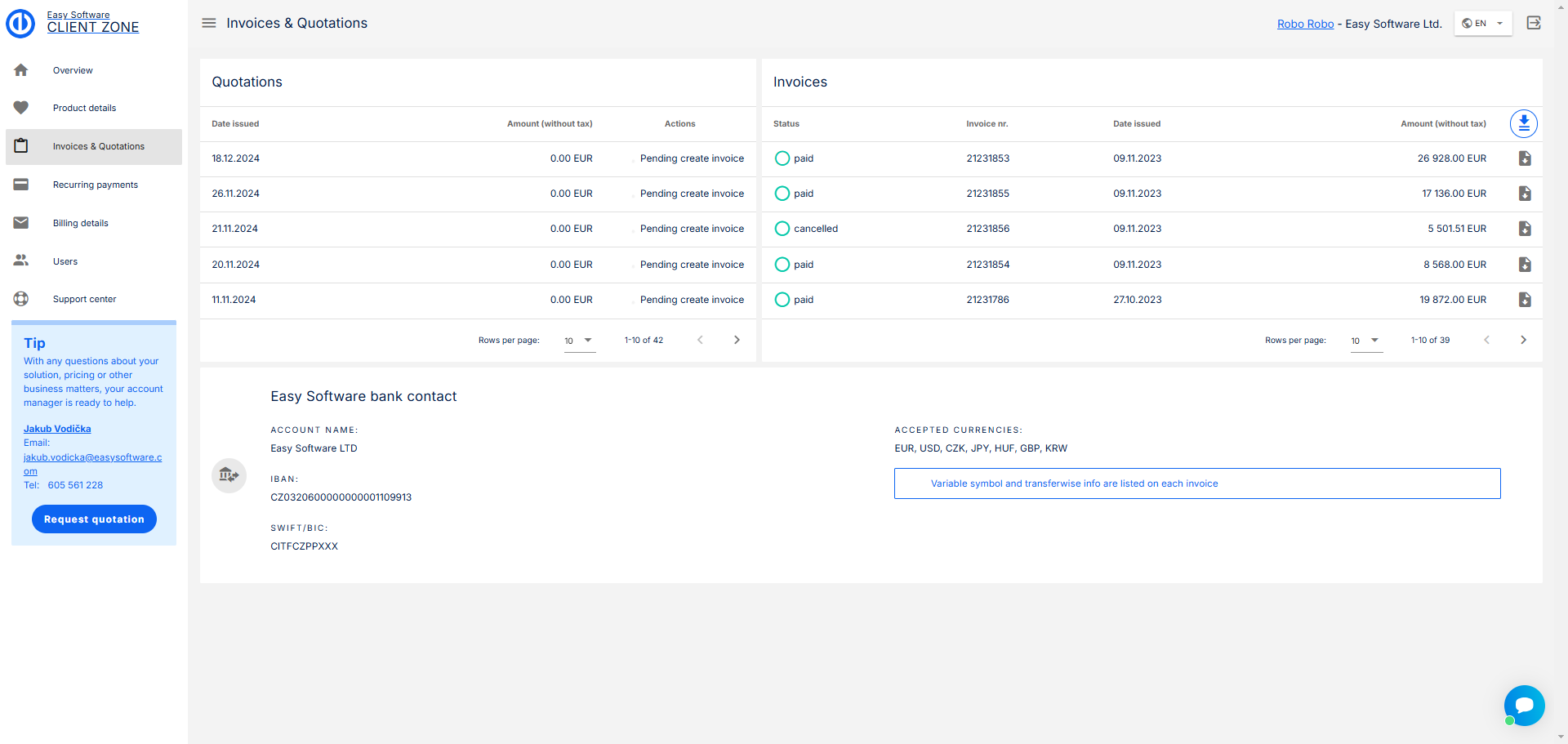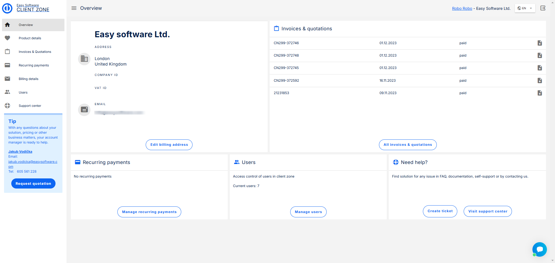Na této stránce najdete, jak název napovídá, přehled vašeho Easy Projectu, uvidíte své fakturační údaje, faktury a nabídky i smlouvy. Najdete zde také tlačítka pro úpravu fakturační adresy a tlačítko, které vás přesměruje na všechny faktury a nabídky.