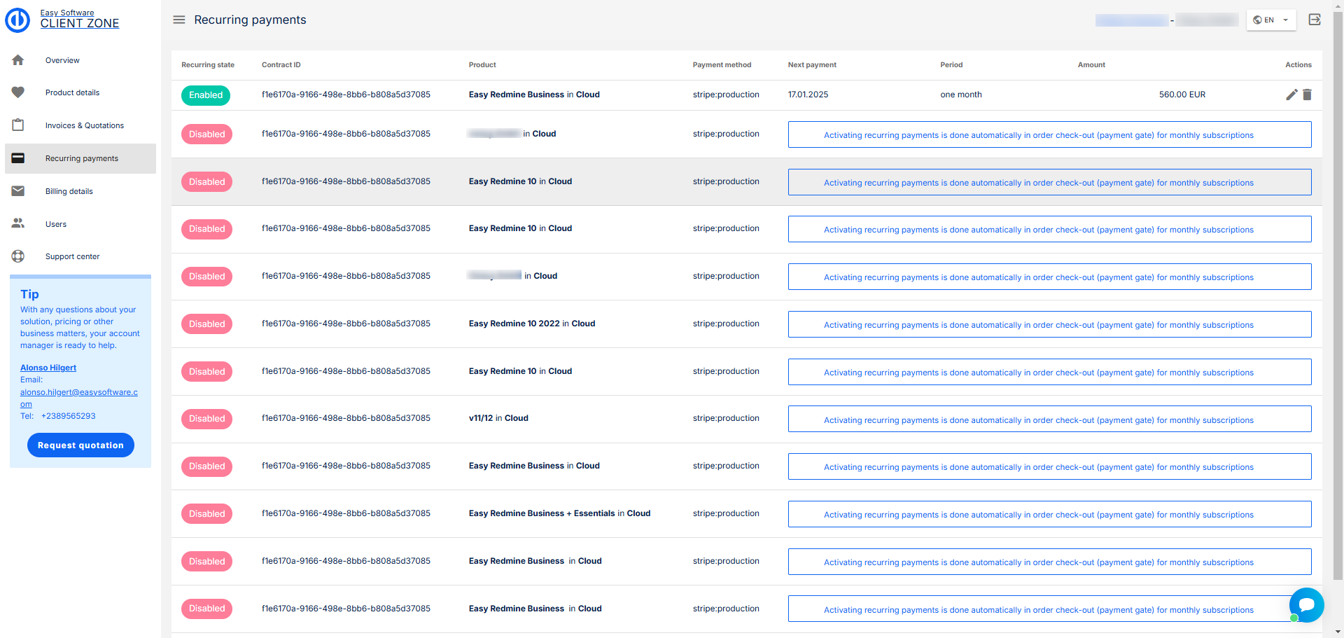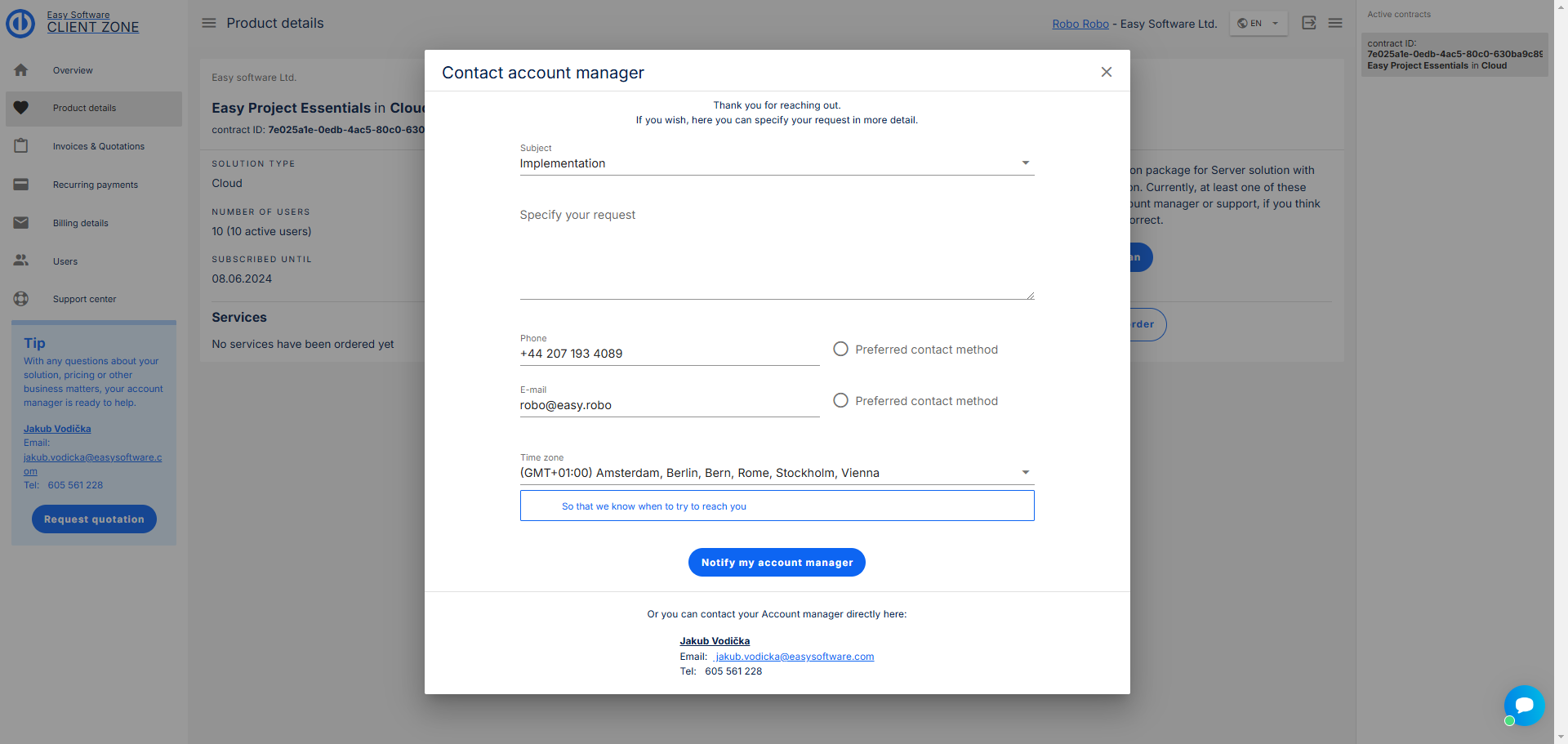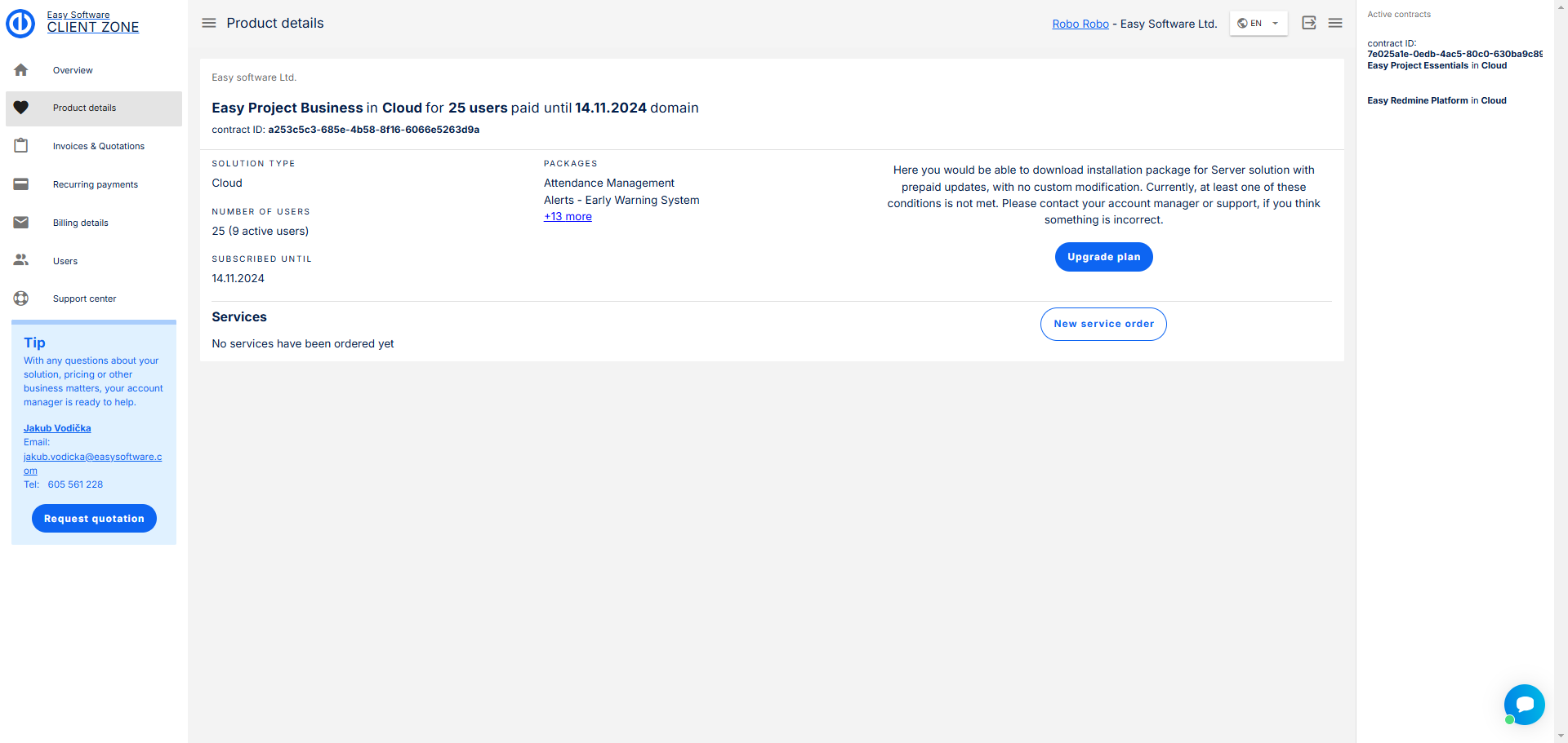 V této sekci najdete podrobnosti o vaší aktuální smlouvě, jako je řešení, počet uživatelů, balíček, který máte, a datum vypršení platnosti.