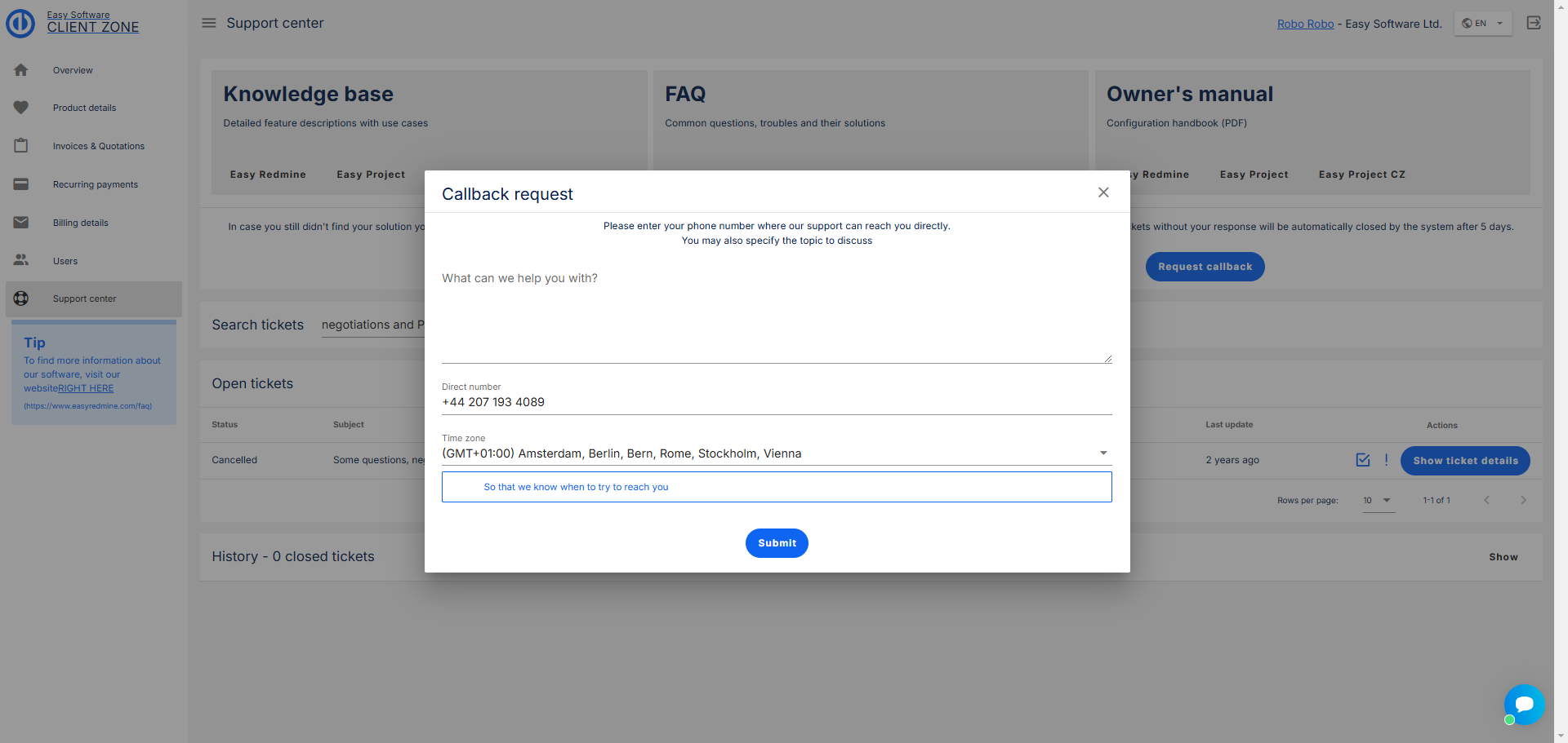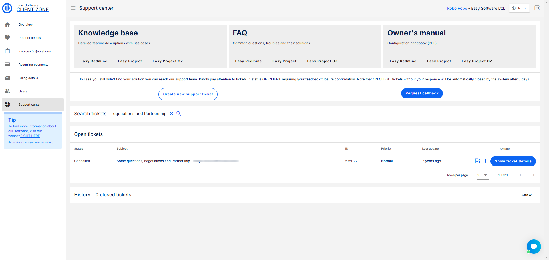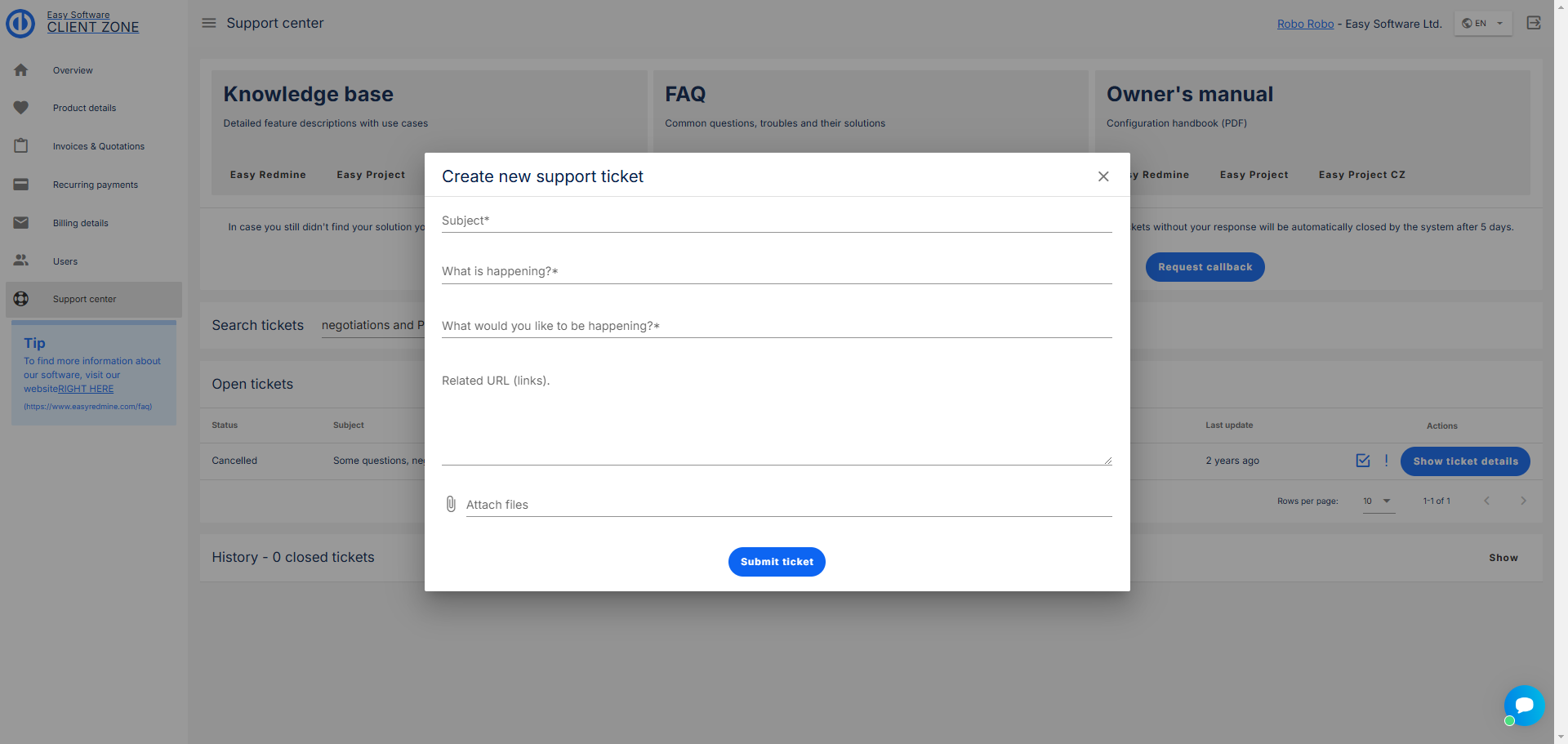 Aby byla komunikace s naší podporou a celková správa Easy Project ještě snadnější, vytvořili jsme Klientskou zónu.