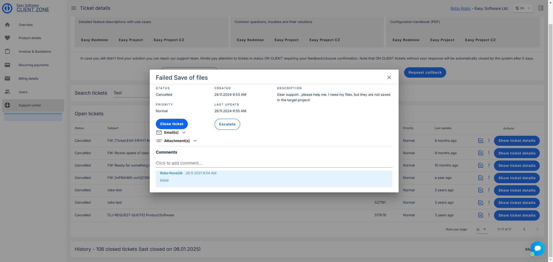 Eskalace tiketu zvýší prioritu, což posune tiket výše v seznamu podpory. (Při eskalaci tiketu prosím vezměte na vědomí klasifikaci závažnosti uvedenou na následující stránce: https://www.easyproject.cz/services/support)