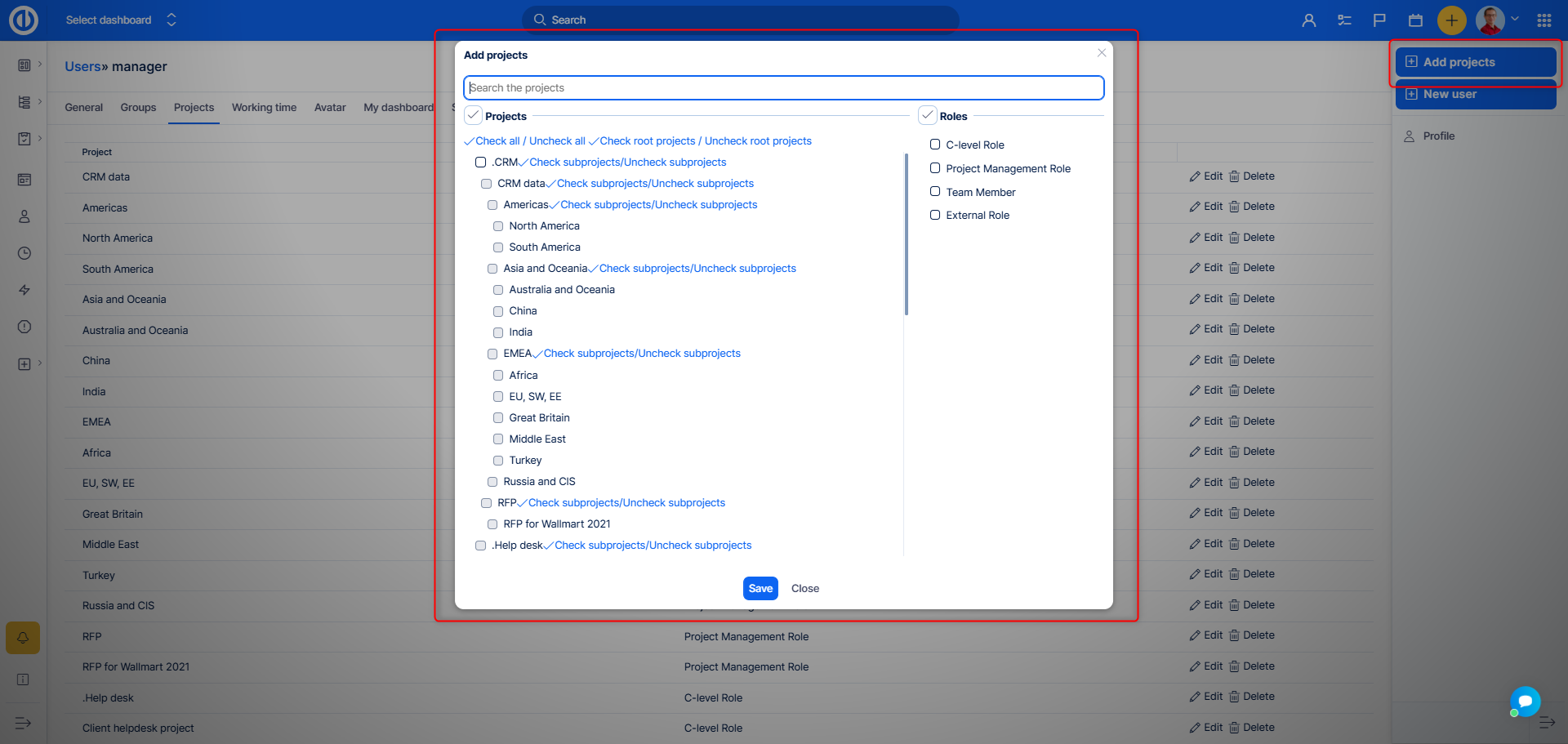 - Pro přidání uživatele samostatně, přiřazení ho přímo do projektu. Přejděte na záložku Projekt >> Přidat projekty. Objeví se vyskakovací okno, kde můžete vybrat více projektů a více rolí najednou.