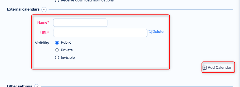 Pro přidání nového kalendáře klikněte na příslušné tlačítko. Vyplňte název, URL a nastavte viditelnost.