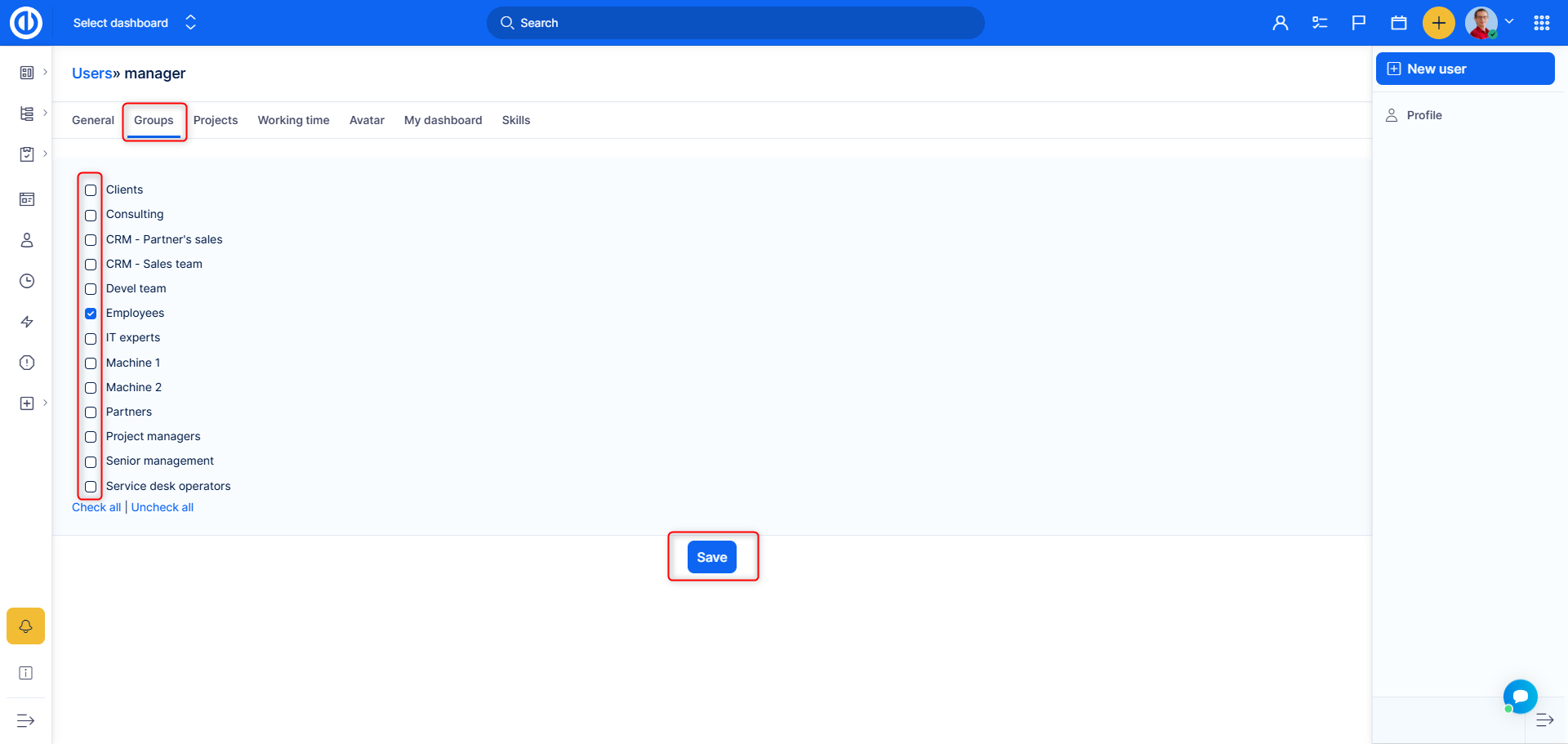- Pro přidání uživatele do skupiny otevřete záložku Skupiny. Zde najdete seznam dostupných skupin, jednoduše zaškrtněte požadované skupiny a uložte.