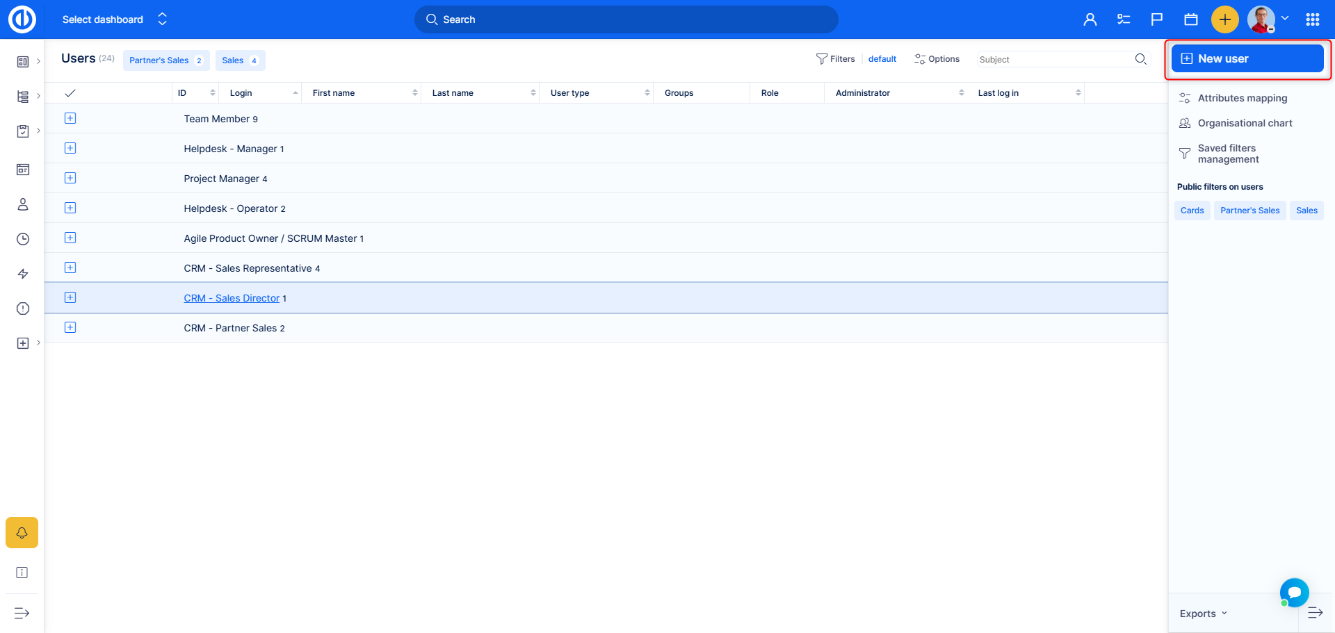 Nový uživatel může být přidán v Globální nabídce >> Administrace >> Uživatelé nebo jednoduše Globální nabídka >> Uživatelé. Klikněte na tlačítko "Nový uživatel".