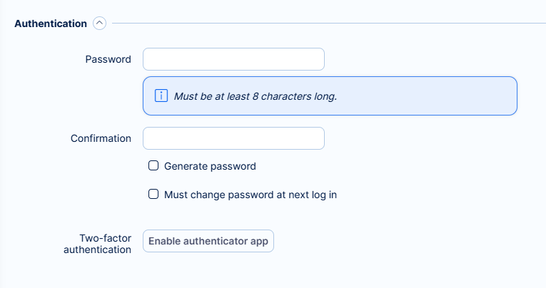 Zde můžete buď nastavit heslo ručně, vygenerovat bezpečné heslo, nebo požádat uživatele, aby si při dalším přihlášení vytvořil nové heslo, což zajišťuje flexibilitu a bezpečnost při nastavení účtu.