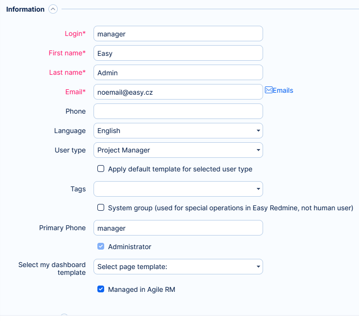 Skupina systému zaškrtávací políčko označuje uživatele, který se používá pro operace využívající REST API, například importování úkolů z externího systému. Tento uživatel je zahrnut do zakoupených licencí. Uživatel se zobrazuje pouze na potřebných místech, jinak je jeho stav skrytý.
