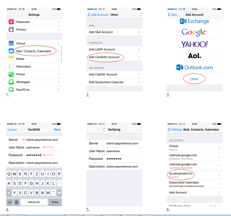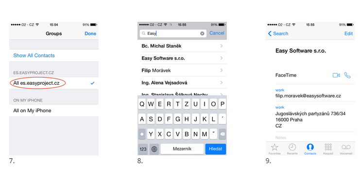 Tato možnost vám pomůže rychle a snadno synchronizovat kontakty Easy Projektu. Můžete si nastavit pravidelnou synchronizaci, takže všechny nově přidané kontakty v Easy Projektu se automaticky načtou také do vašeho mobilního zařízení. Pro zařízení s Androidem použijte CardDav aplikace, s konfigurací popsanou v iOS.