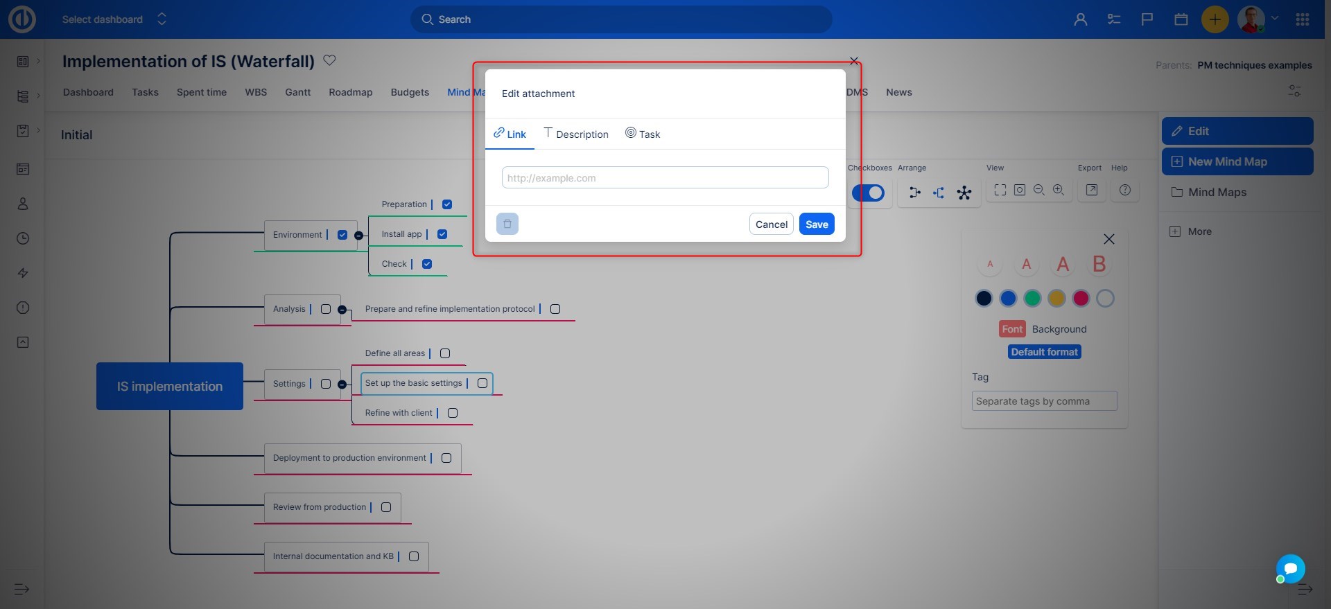 • Doplňte libovolný uzel myšlenkové mapy textovým popisem, adresou URL nebo vazbou na stávající úkol