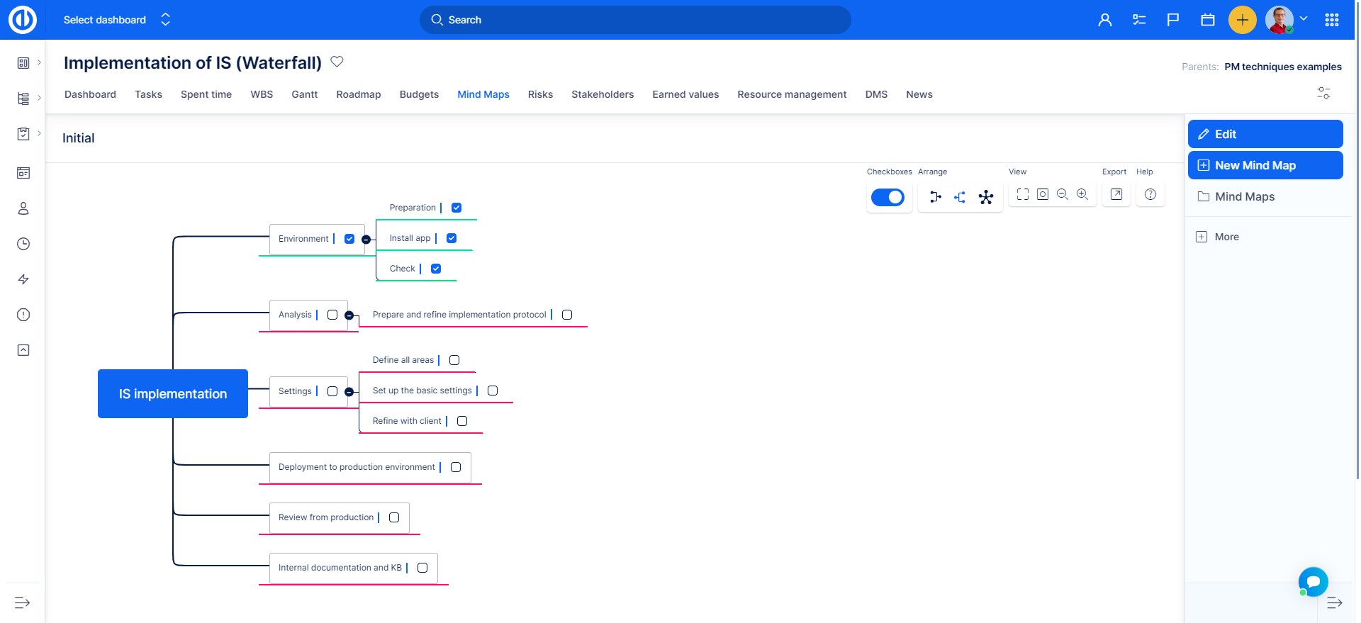 Představte si WBS s 50 úkoly, které rozdělují váš projekt od položek nejvyšší úrovně až po podrobné nápady ve spodní části, kde se aktivně používá pouze 5 úkolů ke komentování, zaznamenávání stráveného času a sledování stavu. Můžete je nahradit myšlenkovou mapou, která vám jako projektovému manažerovi poskytne přehled na vysoké úrovni, a pro těch 5 úkolů, které je opravdu nutné proměnit v úkol, můžete jednoduše vytvořit vazbu uzel-úkol.