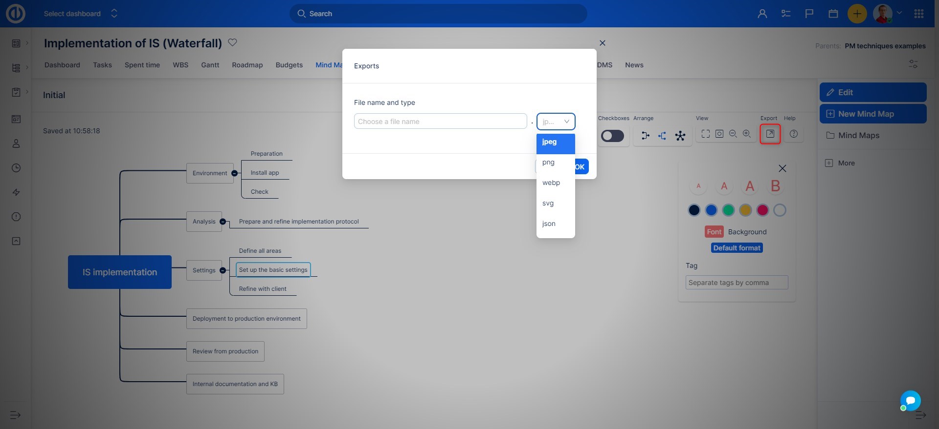 Pokud potřebujete myšlenkovou mapu tisknout, stiskněte tlačítko Exportovat a vyberte jeden z podporovaných formátů. K exportu můžete použít klávesovou zkratku Ctrl+P. Ujistěte se, že je váš kurzor na myšlenkové mapě a jeden z uzlů je aktivní, jinak spustíte funkci tisku ve webovém prohlížeči. Exporty jsou podporovány v následujících formátech.