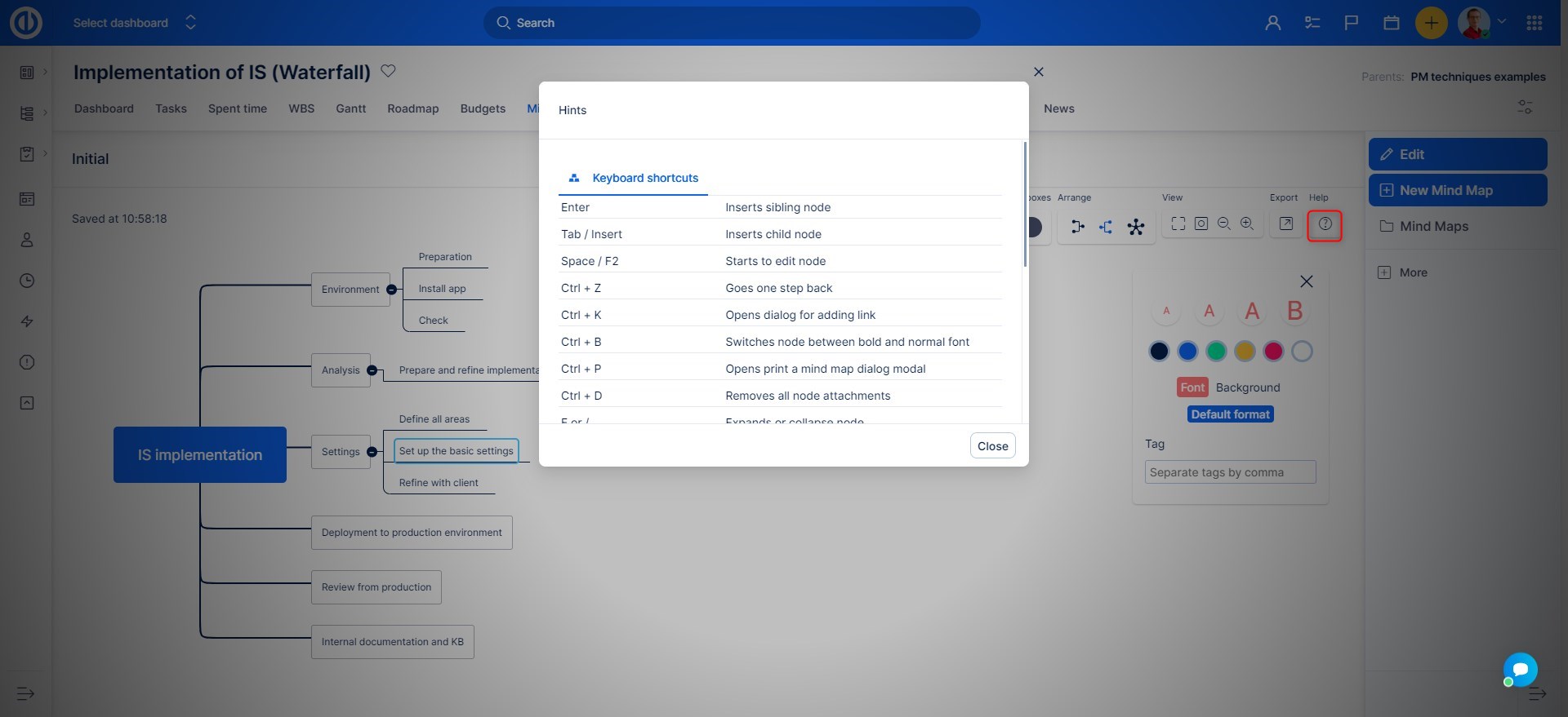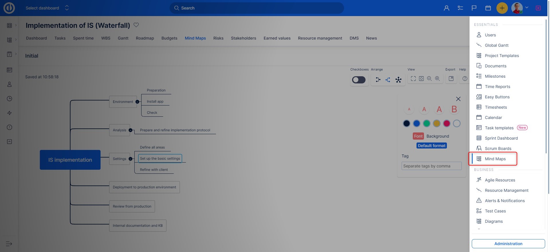 Nyní jste na myšlenkové mapě. K vytvoření nových uzlů použijte klávesy Enter a Tab. Nebo klikněte pravým tlačítkem myši na Přidat děti nebo Přidat sourozence. Každý uzel můžete formátovat. Konkrétně změnit velikost a barvu textu, použít vlastní barvu pozadí. Uzel můžete také označit tagem. Pokud chcete více uzlů, jsou tagy oddělené čárkami. Tyto tagy jsou zcela nezávislé na těch, které znáte z projektů nebo úkolů. Aby se vám na Myšlenkové mapě pracovalo pohodlněji, použijte zobrazení na celou obrazovku.