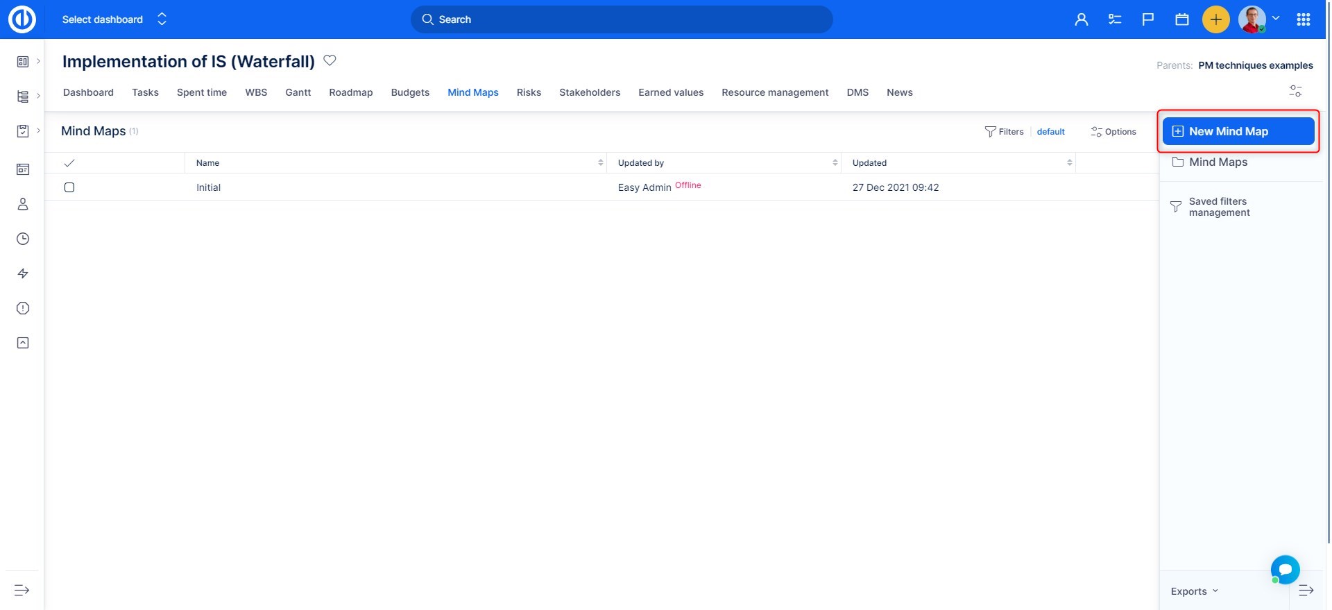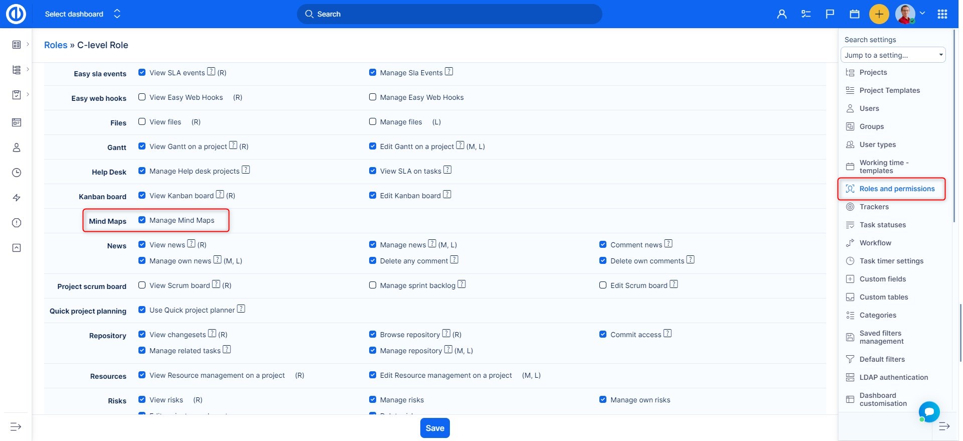 Nejprve se ujistěte, že jste členem příslušného projektu a máte potřebné právo související se správou funkce Myšlenkové mapy. Toto právo lze spravovat v Administraci >> Role a práva >> Myšlenkové mapy. Umožňuje vám dělat vše, co souvisí s myšlenkovými mapami: prohlížet, upravovat, ukládat, sdílet. Administrátoři mají toto právo ve výchozím nastavení.