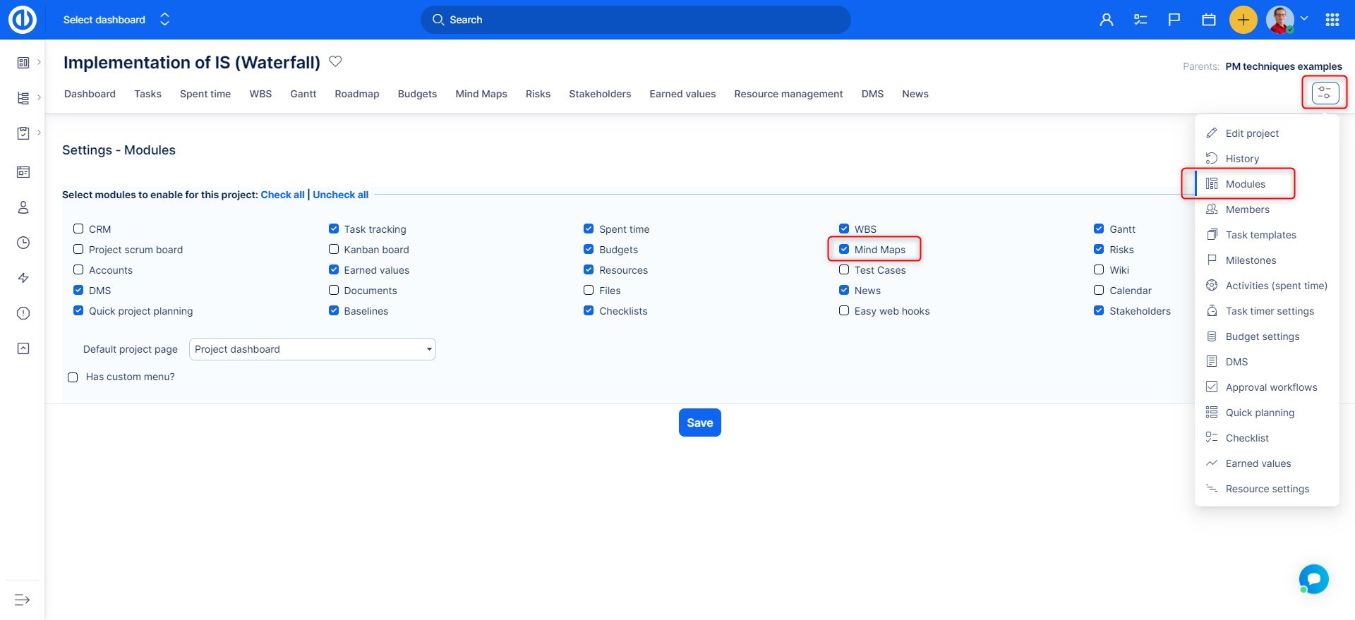 Chcete-li aktivovat Myšlenkové mapy na konkrétním projektu, musíte přejít na moduly projektu, kde najdete zaškrtávací políčko Myšlenkové mapy. Zaškrtněte jej a uložte nastavení.