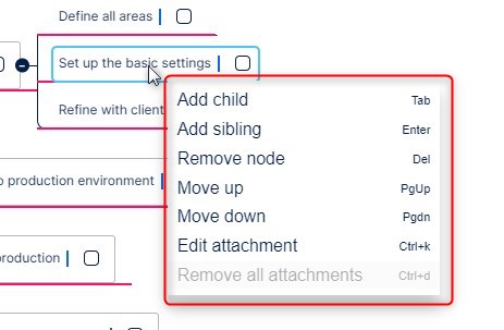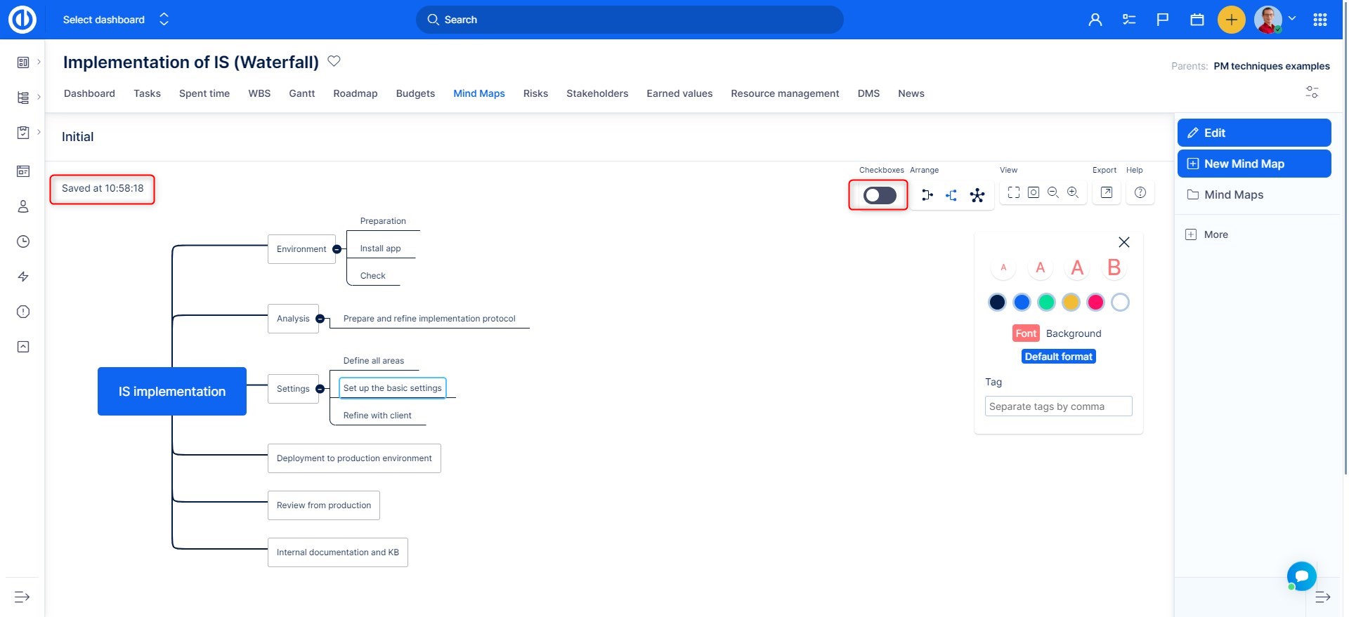 Zaškrtávací políčka jsou skvělá pro sledování průběhu některých procesů. Klikněte na přepínač "Zaškrtávací políčka". Pokud poté kliknete na libovolný uzel, bude zelený. Pokud kliknete znovu, rozsvítí se opět červeně. Tato zaškrtávací políčka se nesynchronizují se zaškrtávacími políčky u úkolů. Zaškrtávací políčka nejsou součástí exportů.