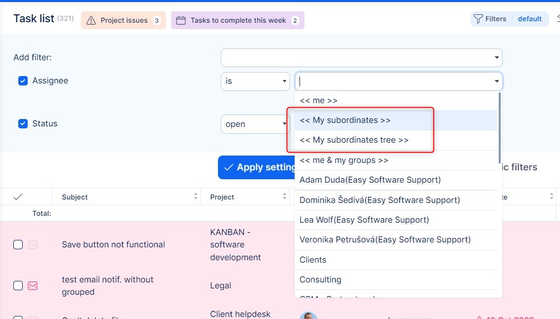 Pokud hledáte v seznamu uživatelů a chcete vidět jen své podřízené, pak si je můžete vyfiltrovat - pomocí filtru "Moji podřízení" v seznamu filtrů.