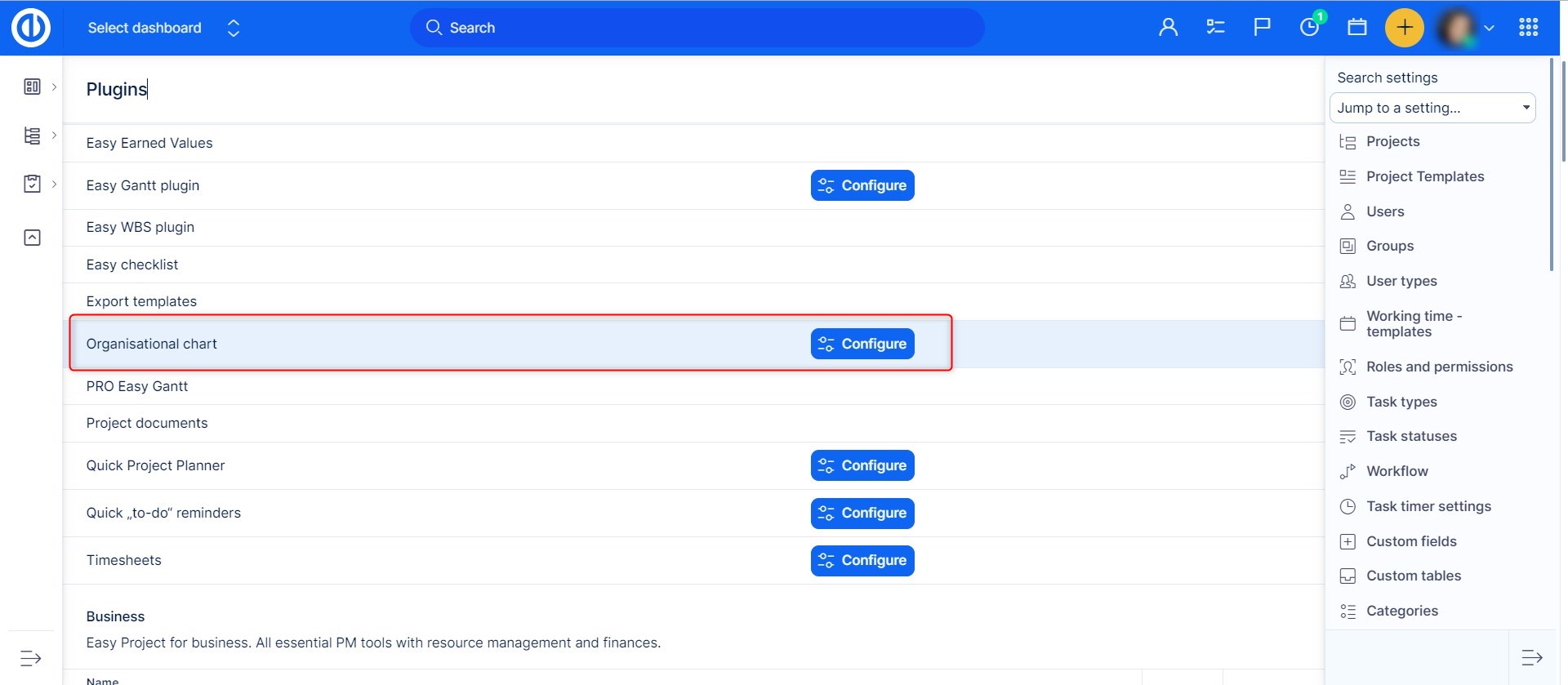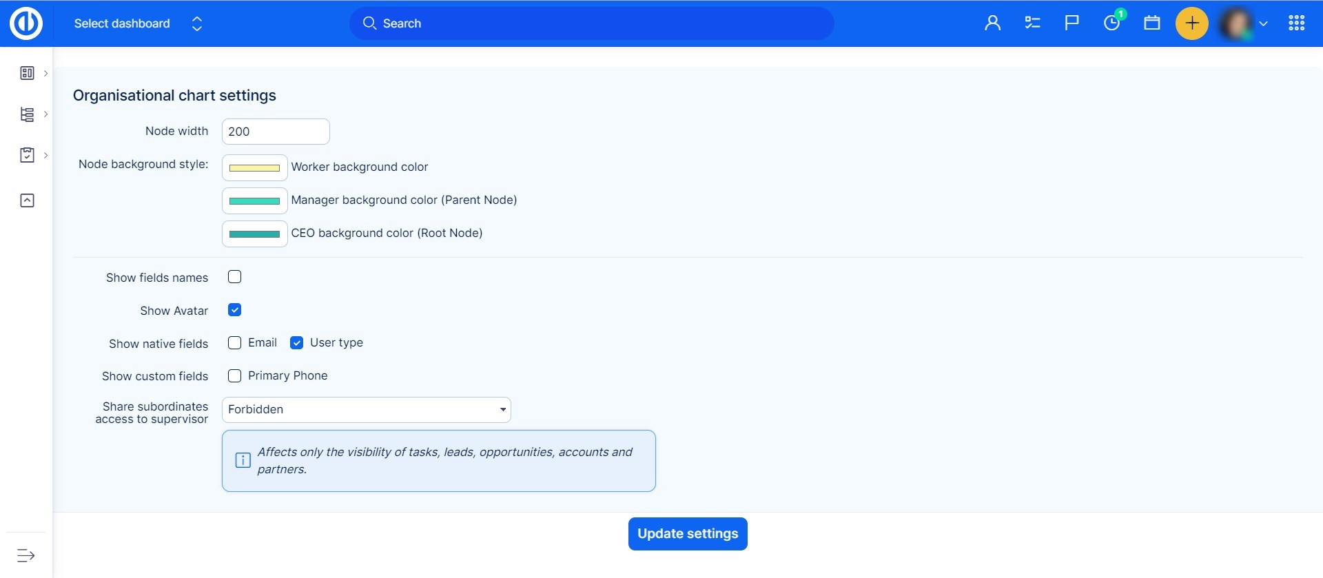 Kliknutím na tlačítko "Konfigurovat" můžete nastavit několik základních funkcní modulu, jako například šířku uzlu, styl pozadí uzlu podle typu (ředitel, manažer, pracovník), zobrazování avatarů, obecných polí, uživatelských polí nebo typů uživatele. Pro uložení změn klikněte na "Uložit nastavení".