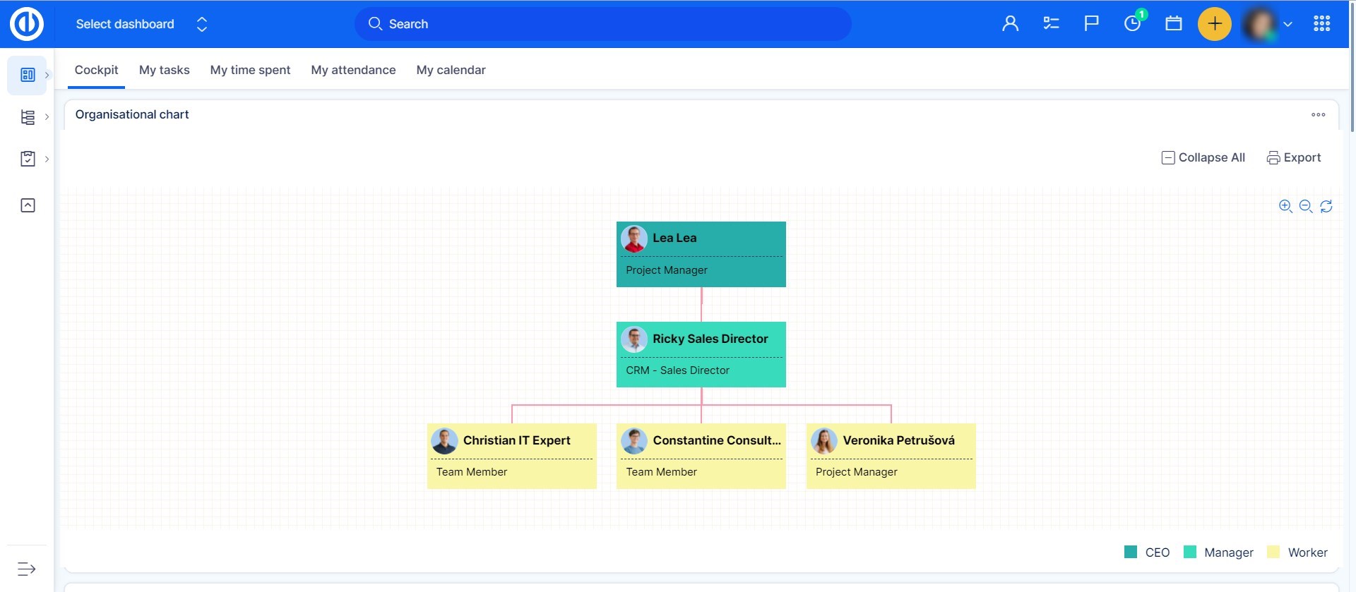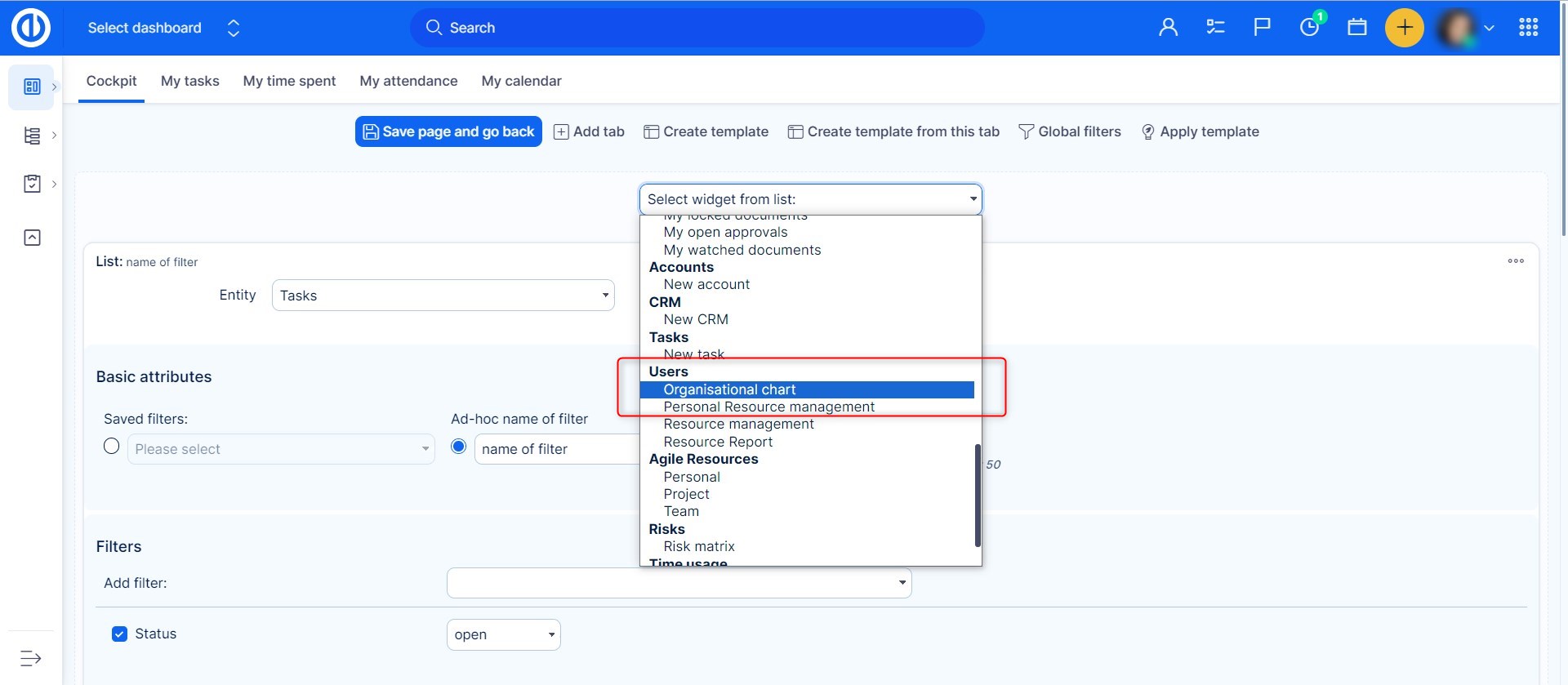 Organizační struktura je také dostupná jako widget pro dashboardy. Klikněte dole na vybrané stránce na "Upravit stránku" a vyberte tento widget z nabídky. Nezapomeňte nastavení uložit!