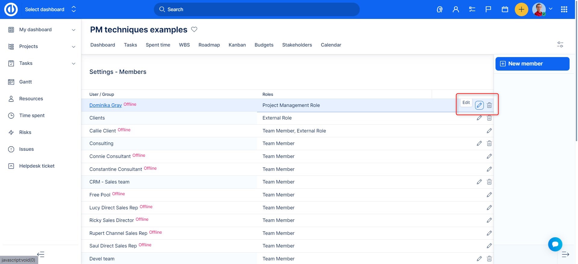Také budete moci upravit role stávajících členů kliknutím na tlačítko Upravit: