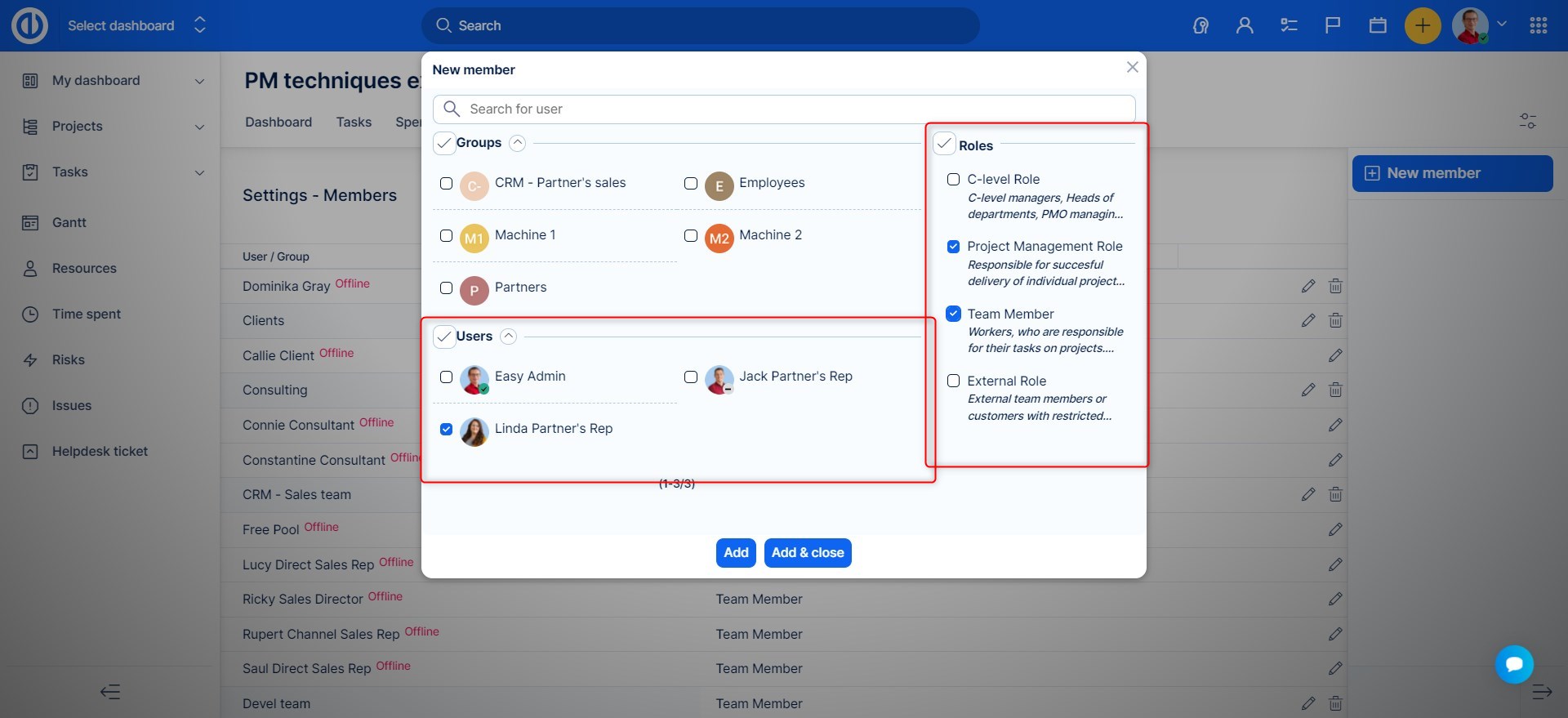 Přiřazení role při přidávání členů do projektu.