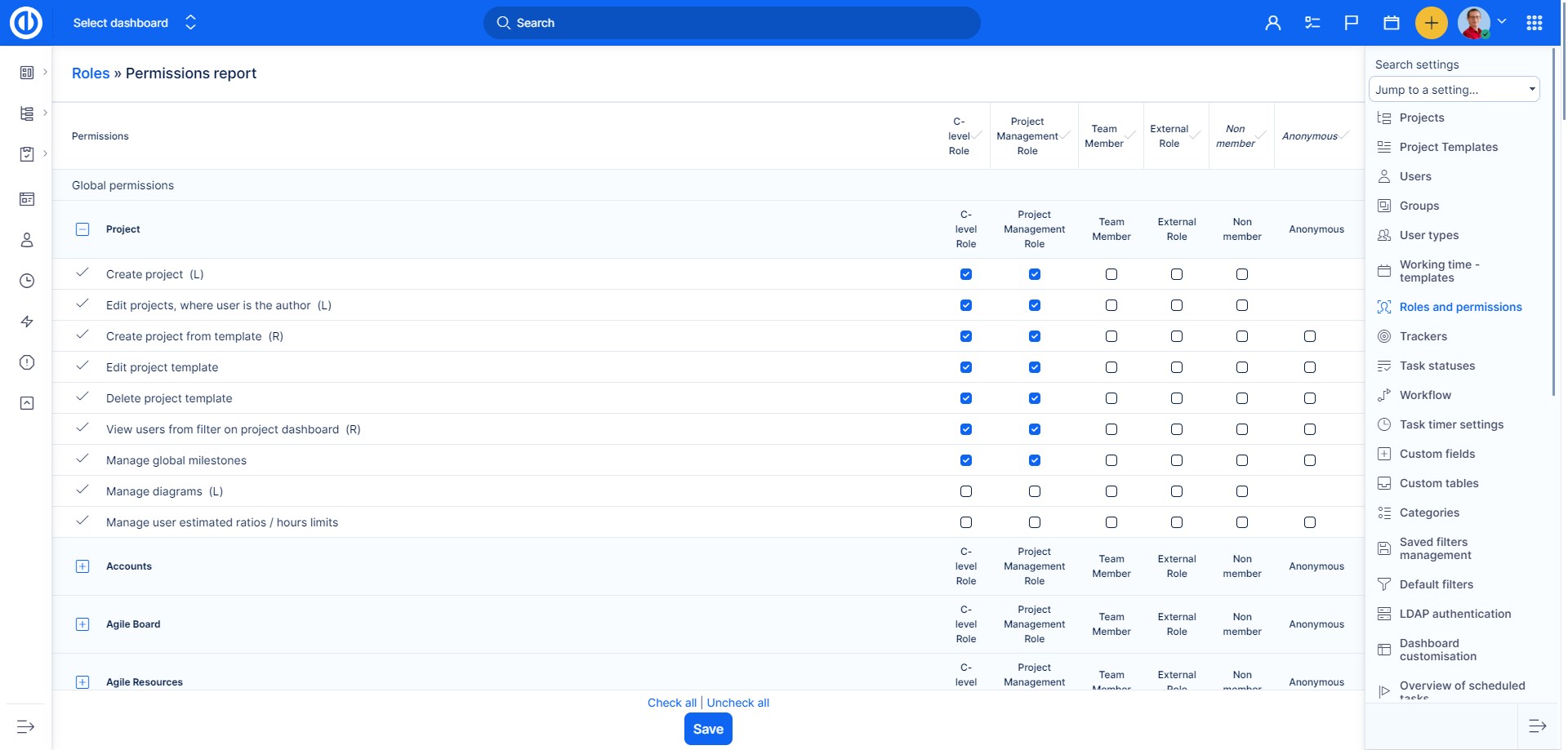 • Globální - pokud je uživatel v této roli v jakémkoli projektu, může provádět tyto akce. Tyto akce jsou platné v celém systému bez vazby na jediný projekt.
