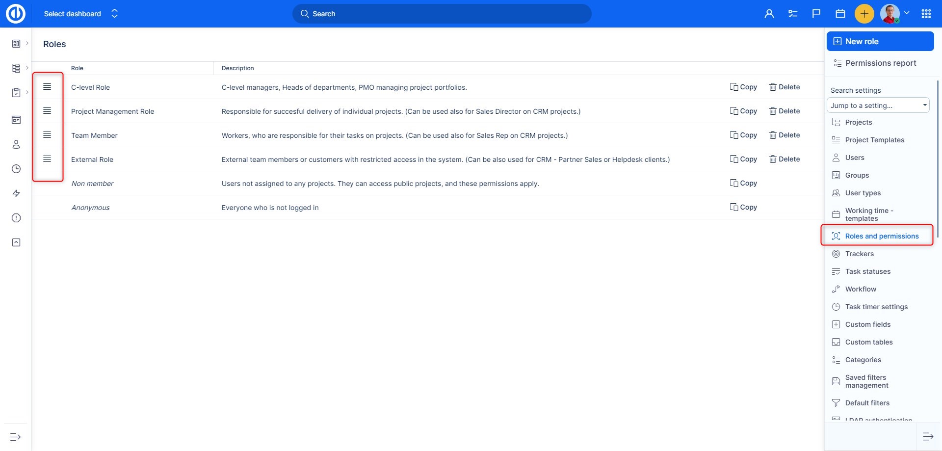 Role lze v seznamu přetahovat, čímž se vytvoří hierarchie, která určuje, která role může odstranit jinou z projektu. Například role A nemůže odstranit roli B z projektu, pokud je role B výše v hierarchii než role A.