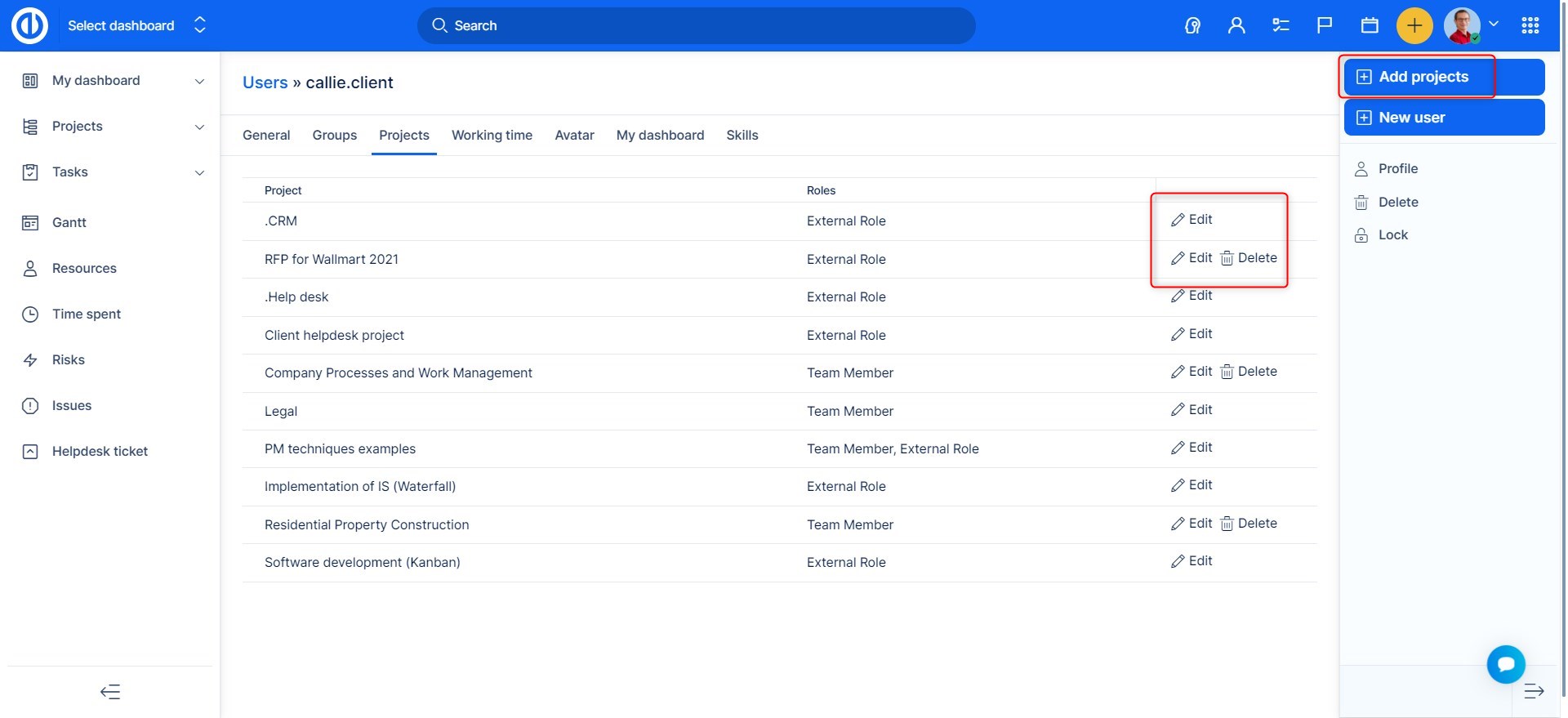 Na kartě Projekty vyberete projekt a přiřadíte/upravíte roli tímto způsobem.