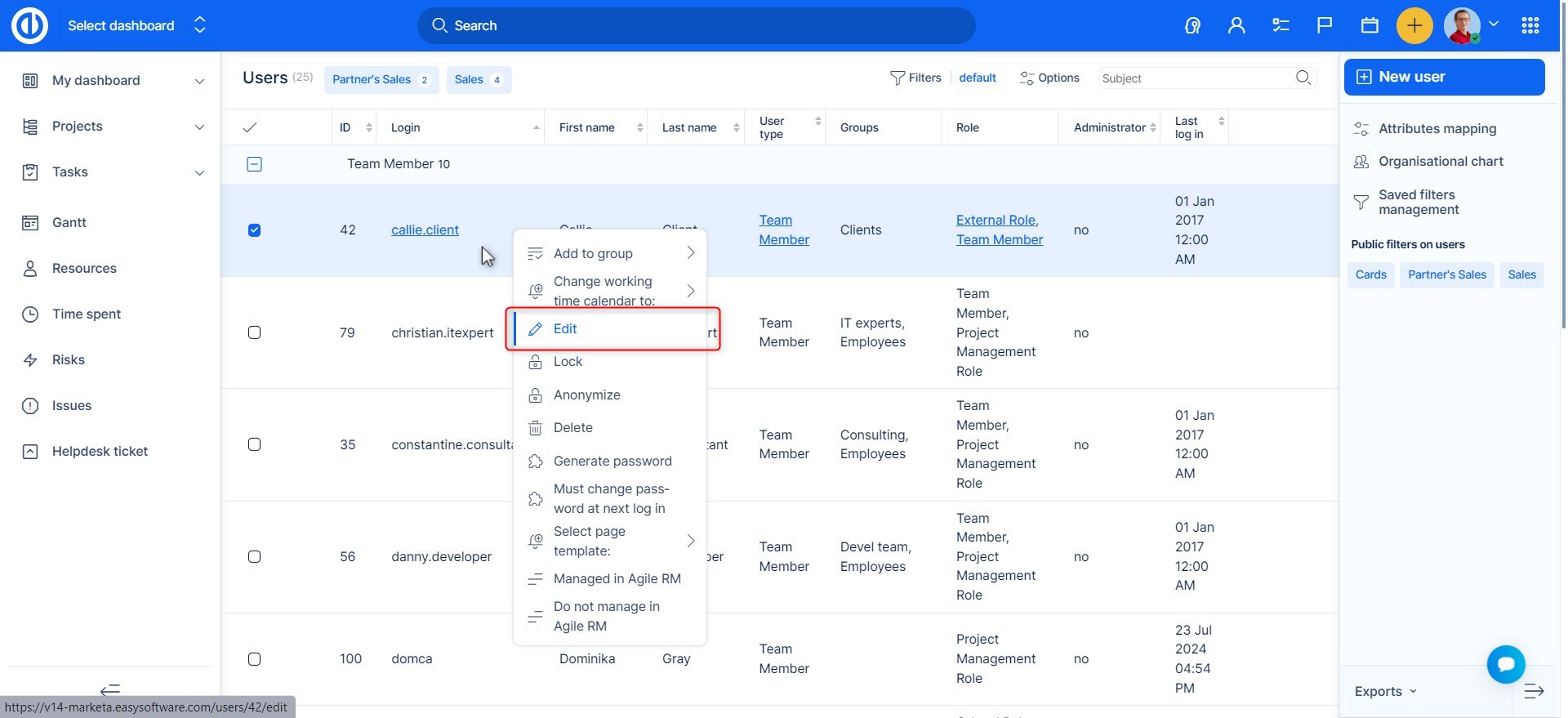 Přejděte do Administrace >> Uživatelé nebo Globální menu >> Uživatelé. Najděte uživatele a klikněte na Upravit.
