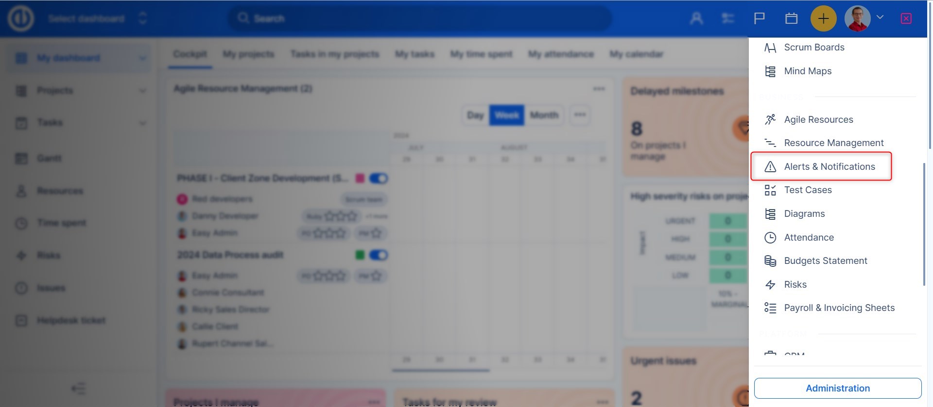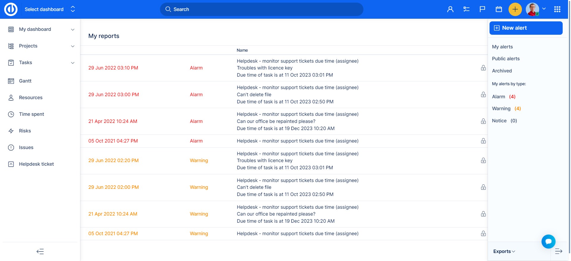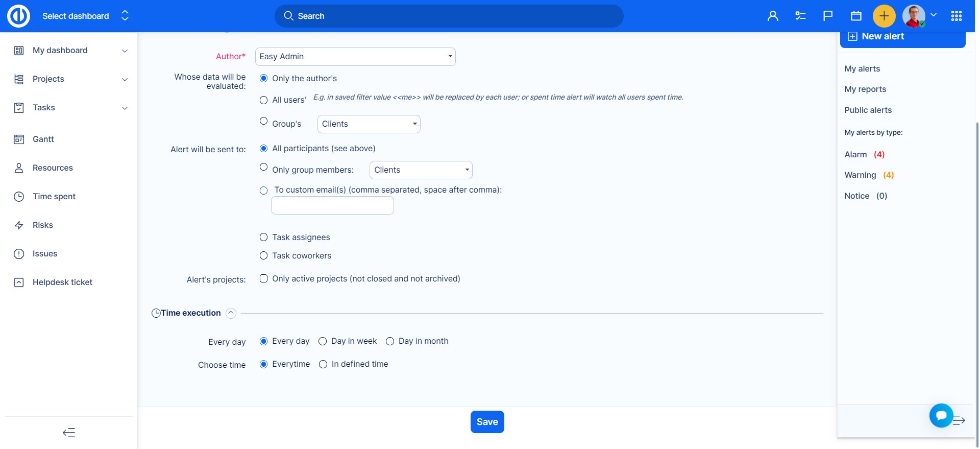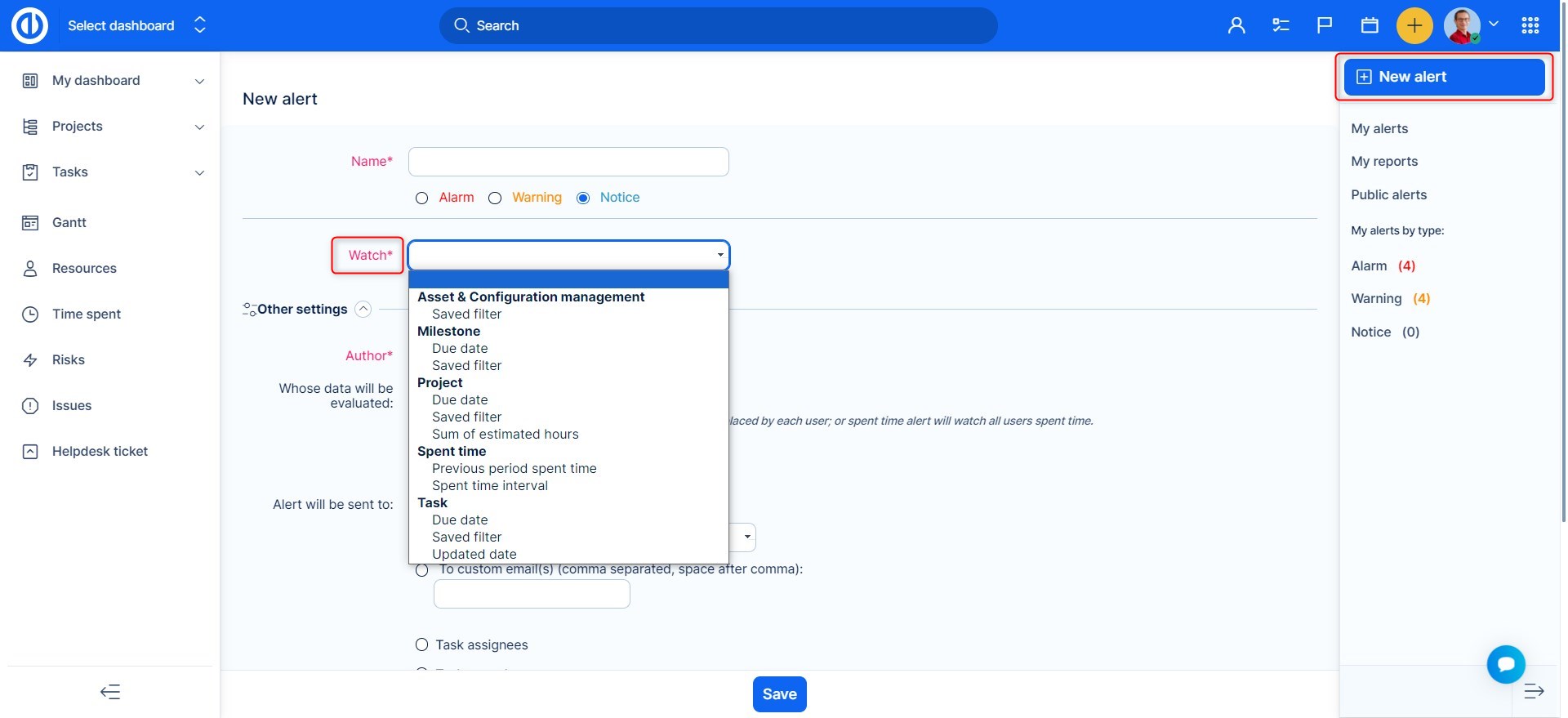 Výstrahy můžete přidávat v menu Další. Jsou navrženy jako systém včasného varování, upozorňují vás na důležité termíny, překročení rozpočtu nebo určeného času. Nejlepším způsobem, jak se vyhnout problémům je jim předcházet. K tomu jsou zde právě Alerty – systém včasného varování. Nadefinujte si vlastní výstrahy, díky kterým budete emailem vždy včas informováni o požadovaných událostech.