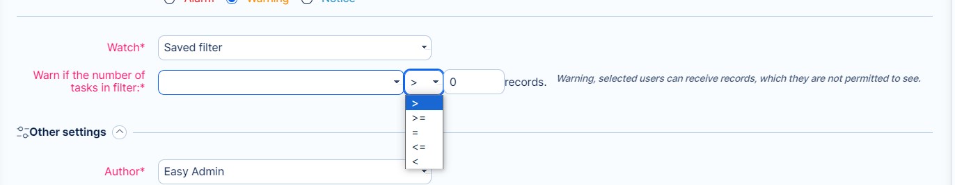 Výstrahy pro nastavené filtry mohou sledovat také výsledky, které jsou v kategorii "více než", "méně než", "rovno", "rovno nebo více než" a "rovno nebo méně než" vybraná hodnota. Díky tomu si můžete nastavit výstrahu i pro filtr s nulovou hodnotou (= 0), třeba v případě, že pracovník teprve čeká na zadání úkolu.