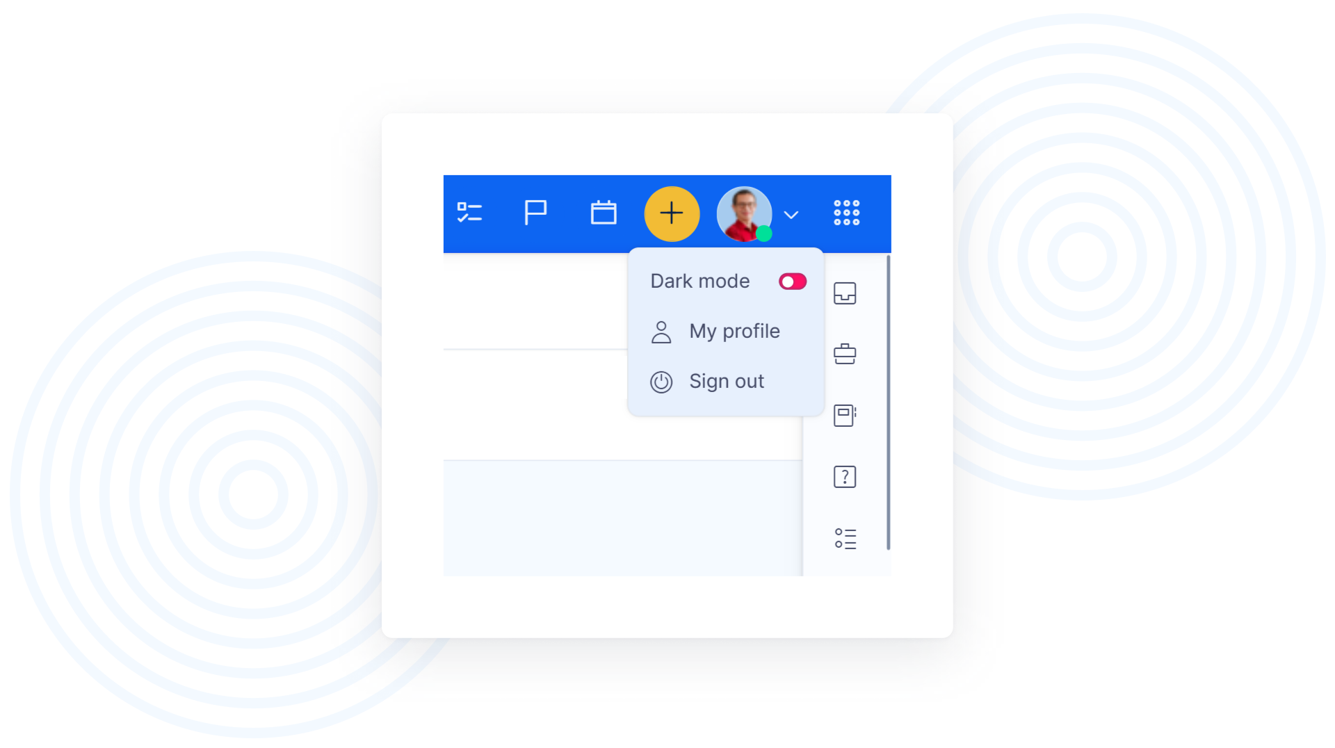 - Tmavý motiv zobrazuje tmavé plochy většiny uživatelského rozhraní, což pomáhá zlepšit vizuální ergonomii snížením namáhání očí a usnadňuje používání obrazovky v tmavých prostředích.