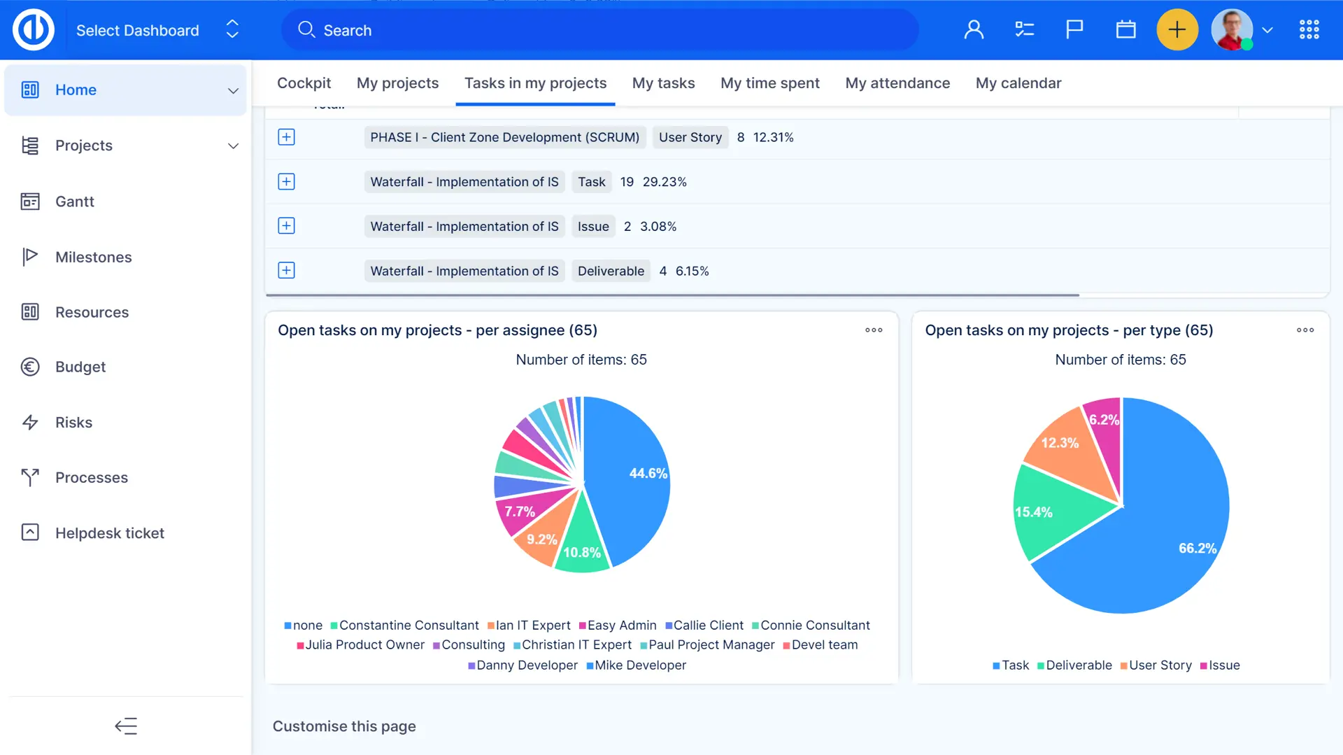 Seznam položek (projekty, úkoly, časové záznamy atd.) lze vizualizovat v grafu nebo grafu, které jsou úplně přizpůsobitelné. V jen pár kliknutích pomocí koláčového, sloupcového nebo čárového grafu můžete připravit zprávu o výkonu vašeho projektu a ukázat, co je třeba zlepšit.
